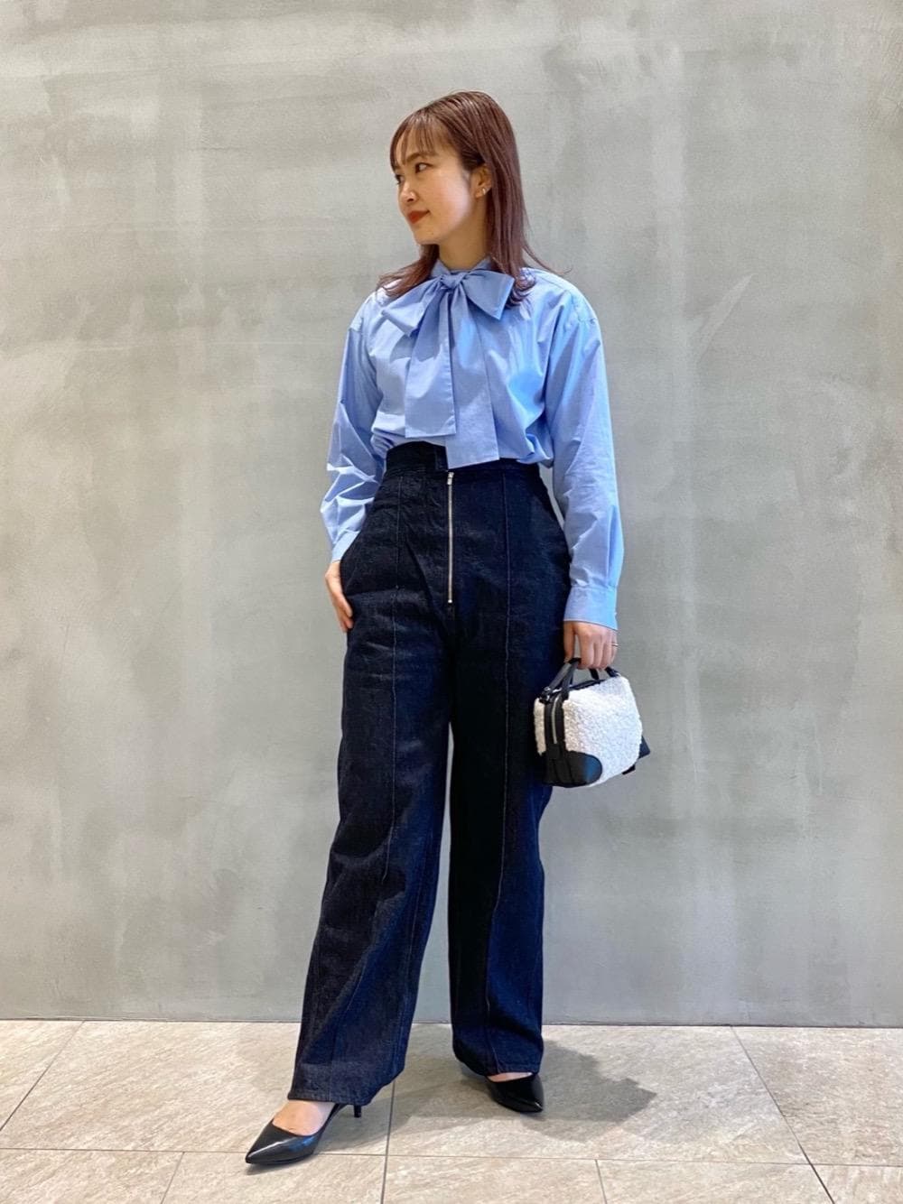 【身長】161cm 【普段】トップス36 ボトムス38 シューズ24.5cm(37h) 【サイズ感】 トップス:標準的 ボトムス:やや大きめですので、ワンサイズ下げて着用 シューズ:幅広、甲高でも0.5cmですが普段通りのサイズ推奨 【素材感】 トップス:ハリ感のあるコットンですが、柔らかさもありシーズン長く着れる素材 ボトムス:厚みのあるデニム生地ですが、柔らかく動きやすいです 【コーディネートポイント】 涼しげなブルーのボウタイブラウスを主役に、デニムで合わせてカジュアルなスタイリングにしました。足元のパンプスで素肌を見せることで全体のバランスをとりました!