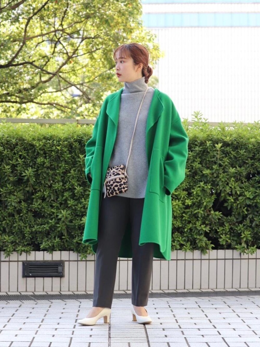 【身長】161cm 【普段】トップス36 ボトムス38 シューズ24.5cm(37h) 【サイズ感】 アウター:ゆったりの為、ワンサイズ下げて着用 ニット:ゆったり ボトムス:ややスリム シューズ:幅広、甲高でも普段通りのサイズ 【コーディネートポイント】 グリーンのコートを主役に、トーンをまとめました。コーディネートに全体がぼやけないようにレオパードのバッグと足元をホワイトにしてメリハリをつけました。