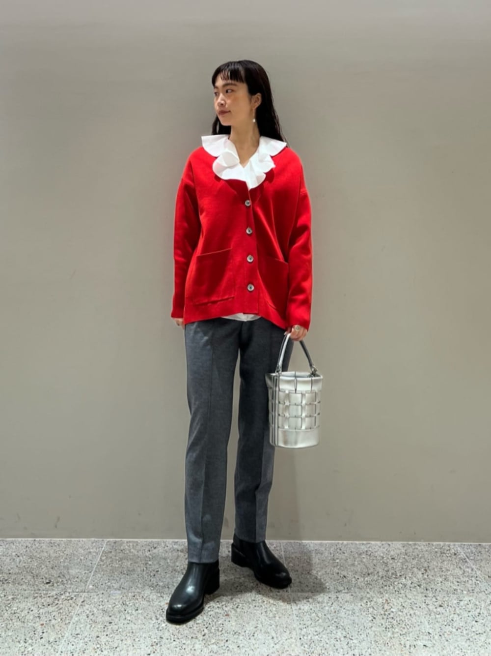 【着心地 サイズ感】 ・カーディガン→ややゆったり もちっとした反発のある生地で、とても着心地がいいです。 ・ブラウス→標準的 伸縮性はほとんどなく、エレガントな印象です。 ・パンツ→細め、標準的 すっきりしたシルエット、暖かみのある生地です。