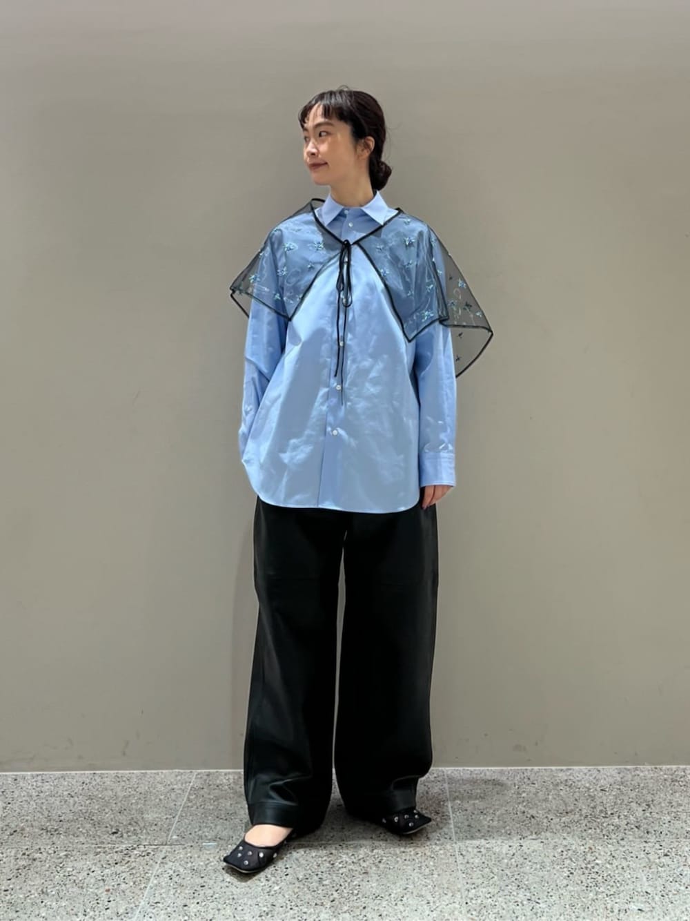 tana(ユナイテッドアローズ 麻布台ヒルズ ウィメンズストア)のストール/ショール「<LOEFF>ブルーベリー エンブロイダリー サロン」を使ったコーディネート