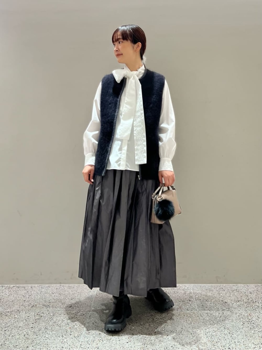 【着心地 サイズ感】 ・ベスト→標準的 ・ブラウス→標準〜やや肩周りコンパクトに感じました。 ・スカート→標準〜ややゆったり 【コーディネートポイント】 それぞれ存在感のあるアイテム同士ですが、異素材で合わせてコーディネートをまとめました。
