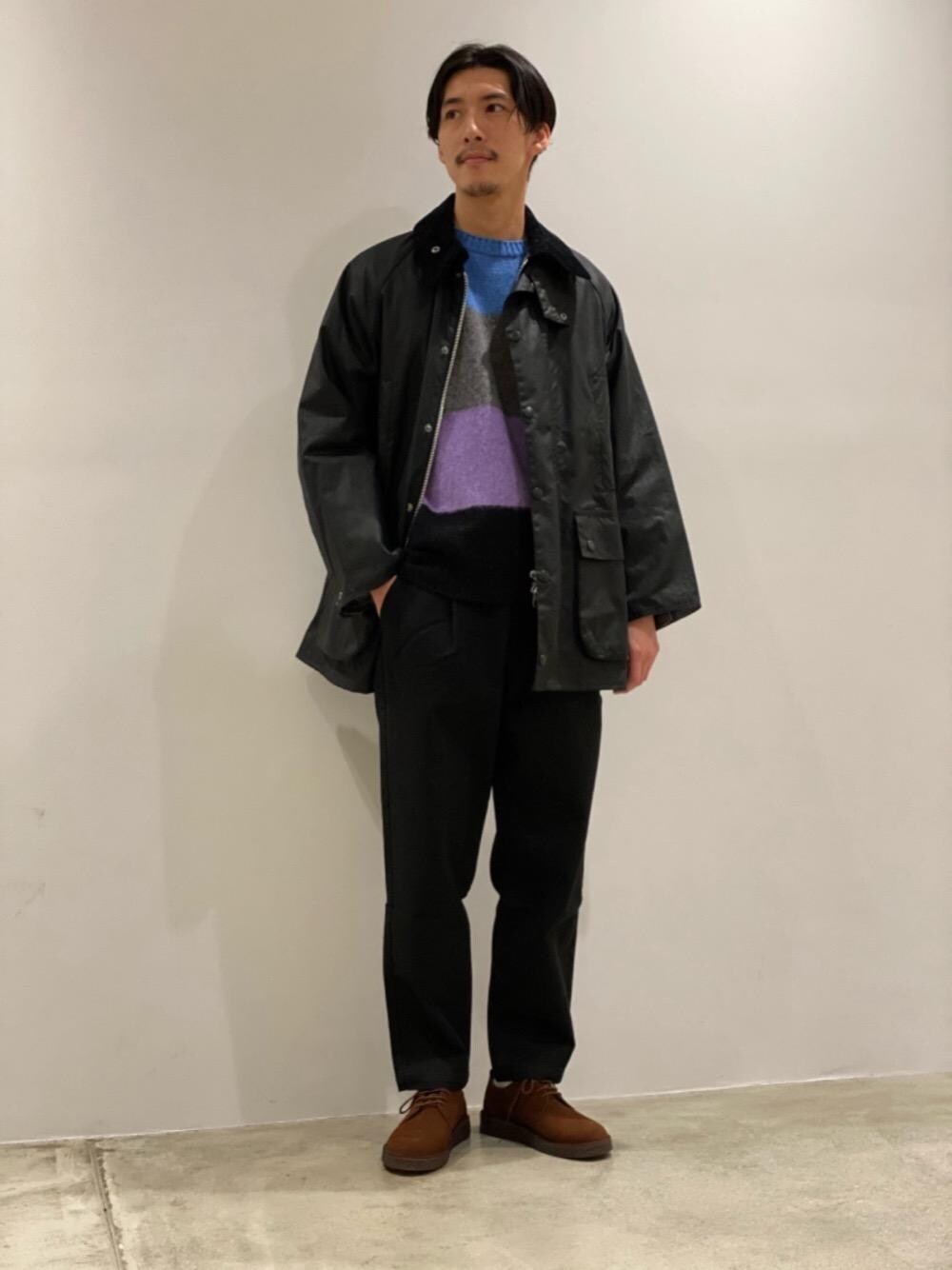 男らしいバブアーのオイルドコートにカラフルなウールニットを合わせ、柔らかで温かみのあるスタイリングにしてみました。足元も黒では無く、茶色をセレクトしキメすぎていないのがポイントです。