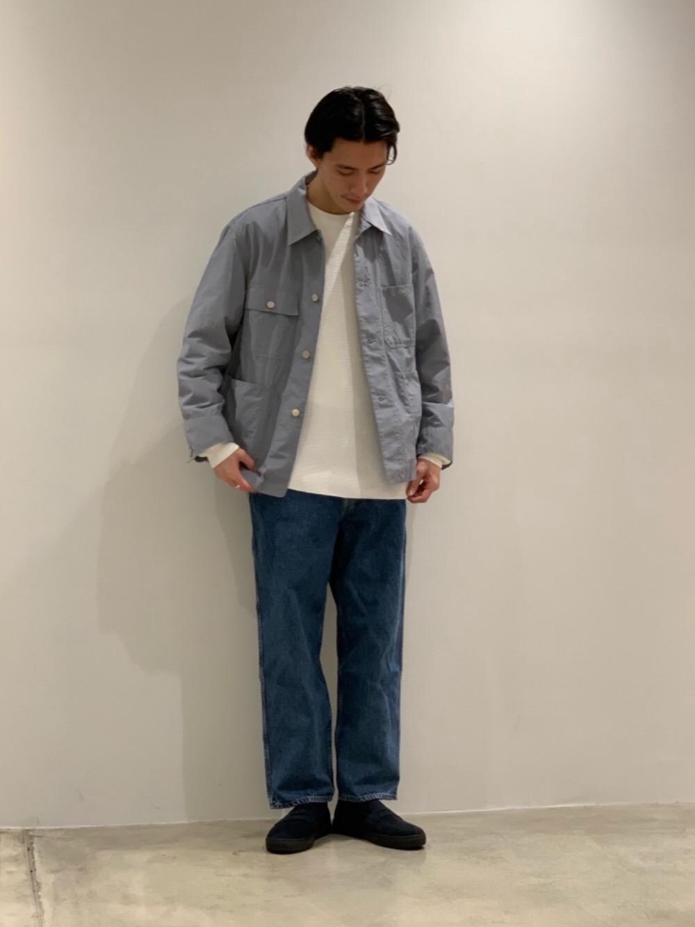 今履きたいやや野暮ったい形のデニムと爽やかな水色&ナイロン素材の軽やかなカバーオールを合わせ、洒落感を出しました。 足元は、ペニーローファーを合わせ、コーディネートにメリハリをつけました。