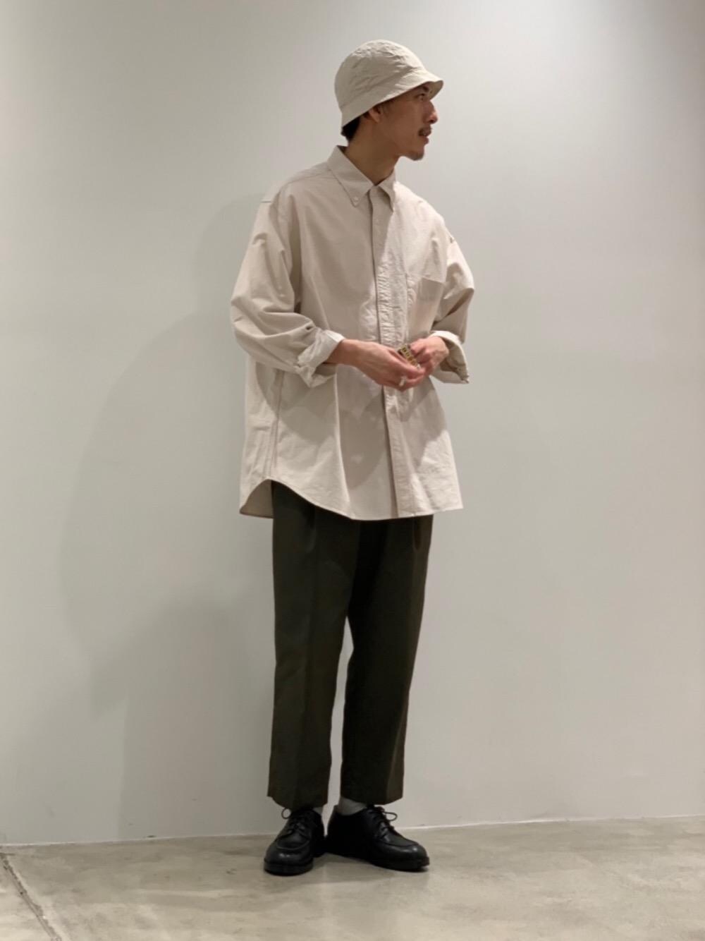 オーバーサイズのコットンシャツと帽子の色を合わせてコーディネートを組みました。スニーカー合わせも勿論良いですが、足元は革靴で少し上品な印象を持たせました。