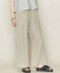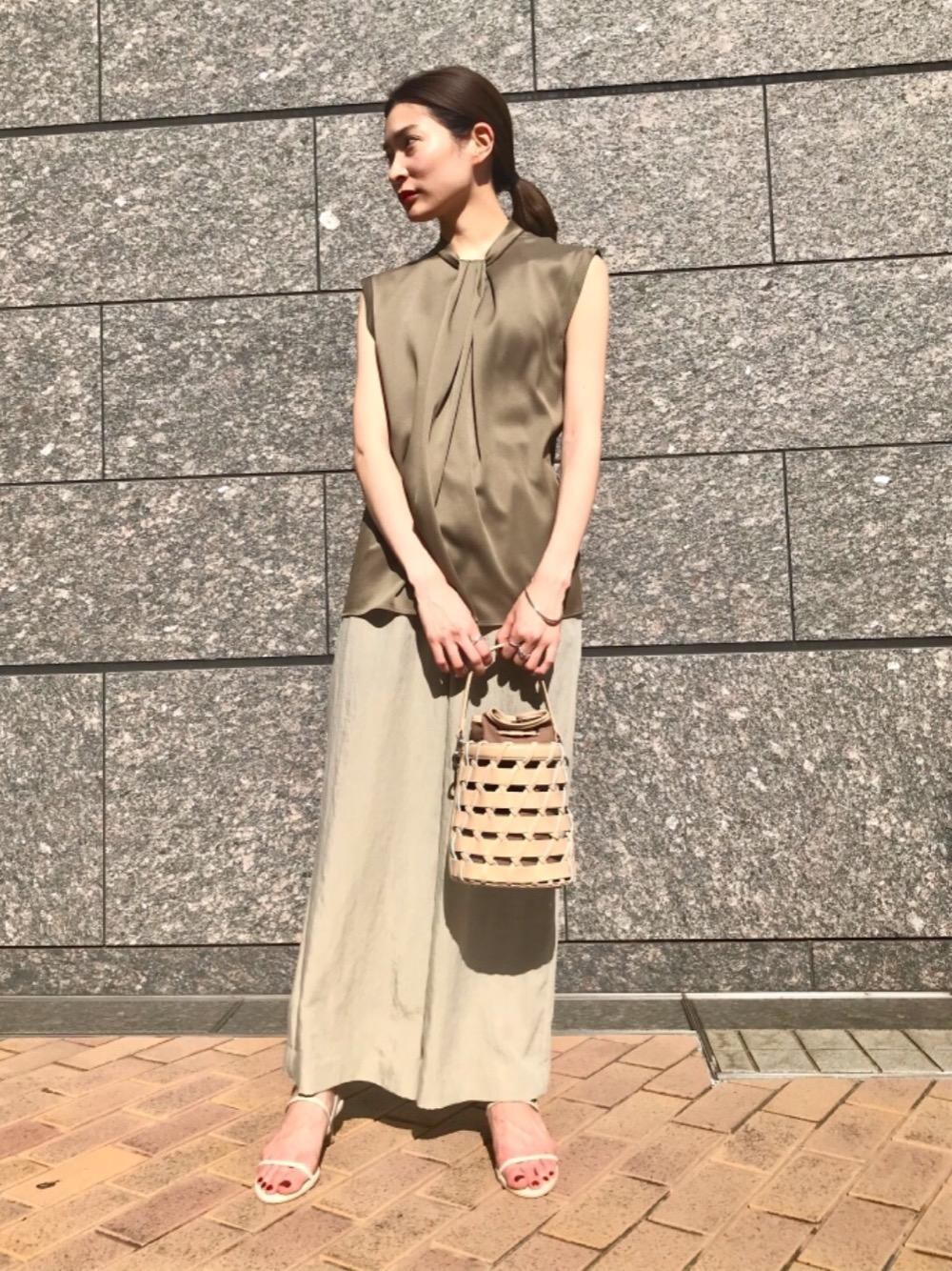 オリーブの同系色のトップスとパンツを合わせ、グラデーションに致しました。 また、光沢感のある上品なブラウスとシワ感のあるナチュラルな風合いのイージーパンツを合わせ、大人カジュアルにコーディネート致しました。