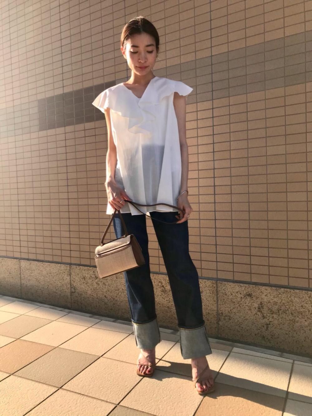 首元のラッフルフリルが華やかで女性らしいブラウスに甘くなりすぎないよう、デニムと合わせました。 髪も結んで襟元を見せるのがおすすめです。