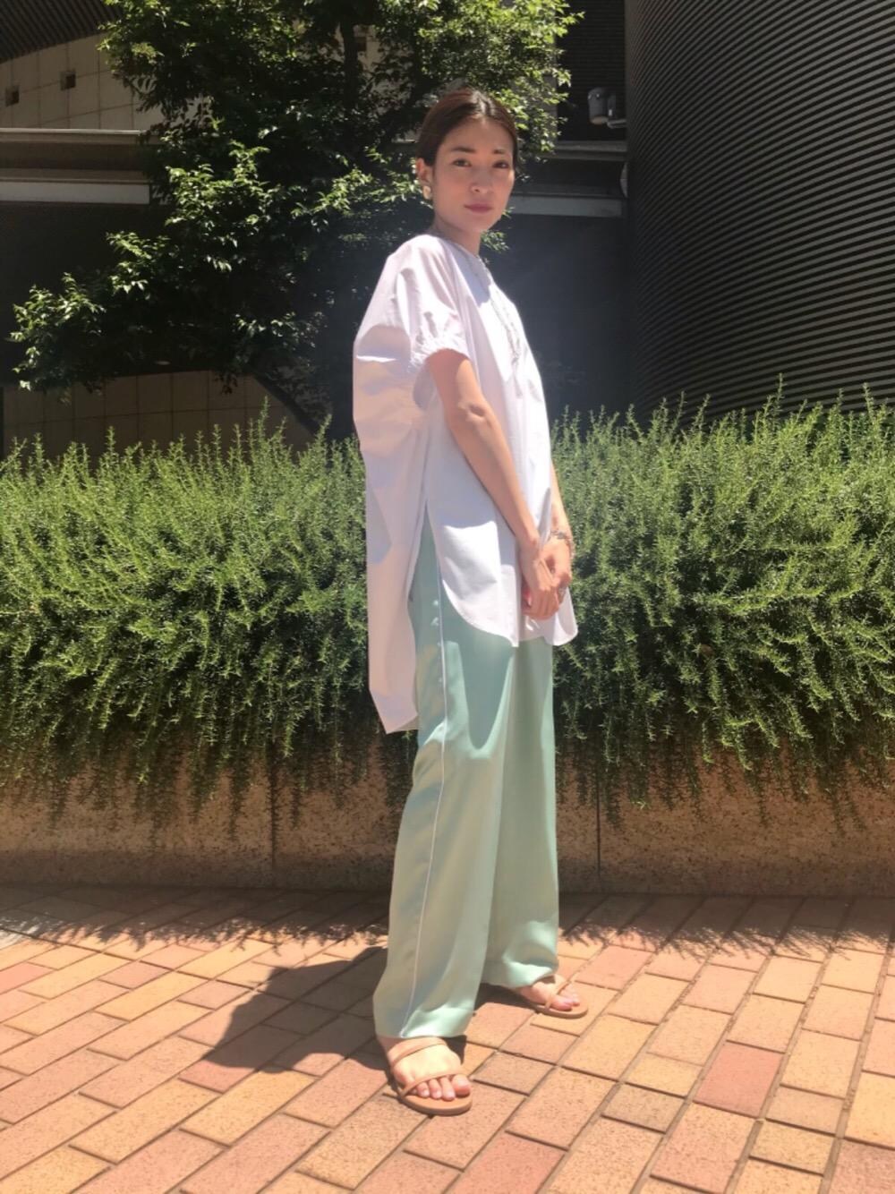 身長:160cm 普段サイズ:トップス36/ボトムス34or36/シューズ24.5cm 【サイズ感】 ブラウス:オーバーサイズ。 パンツ:やや大きめ。 サンダル:やや小さめ。 【素材感】 ブラウス:すこし張りのある素材。 パンツ:表地は細かい凹凸がありますが、裏地はつるっとした素材。 【着心地】 ブラウス:立体感があり一枚でおしゃれに見せてくれ、サイドに深くスリットが入っておりますので、重たく見えません。 パンツ:薄手で裏地の肌触りが良いので、着心地が良いです。 【コーディネートポイント】 ビックシルエットのブラウスに、パンツはワイドパンツを持ってくるのがトレンドでおすすめです。 ホワイトのブラウスに、光沢のあるライトブルーのパンツを合わせ、涼しげな色合わせでコーディネートしたのもポイントです。