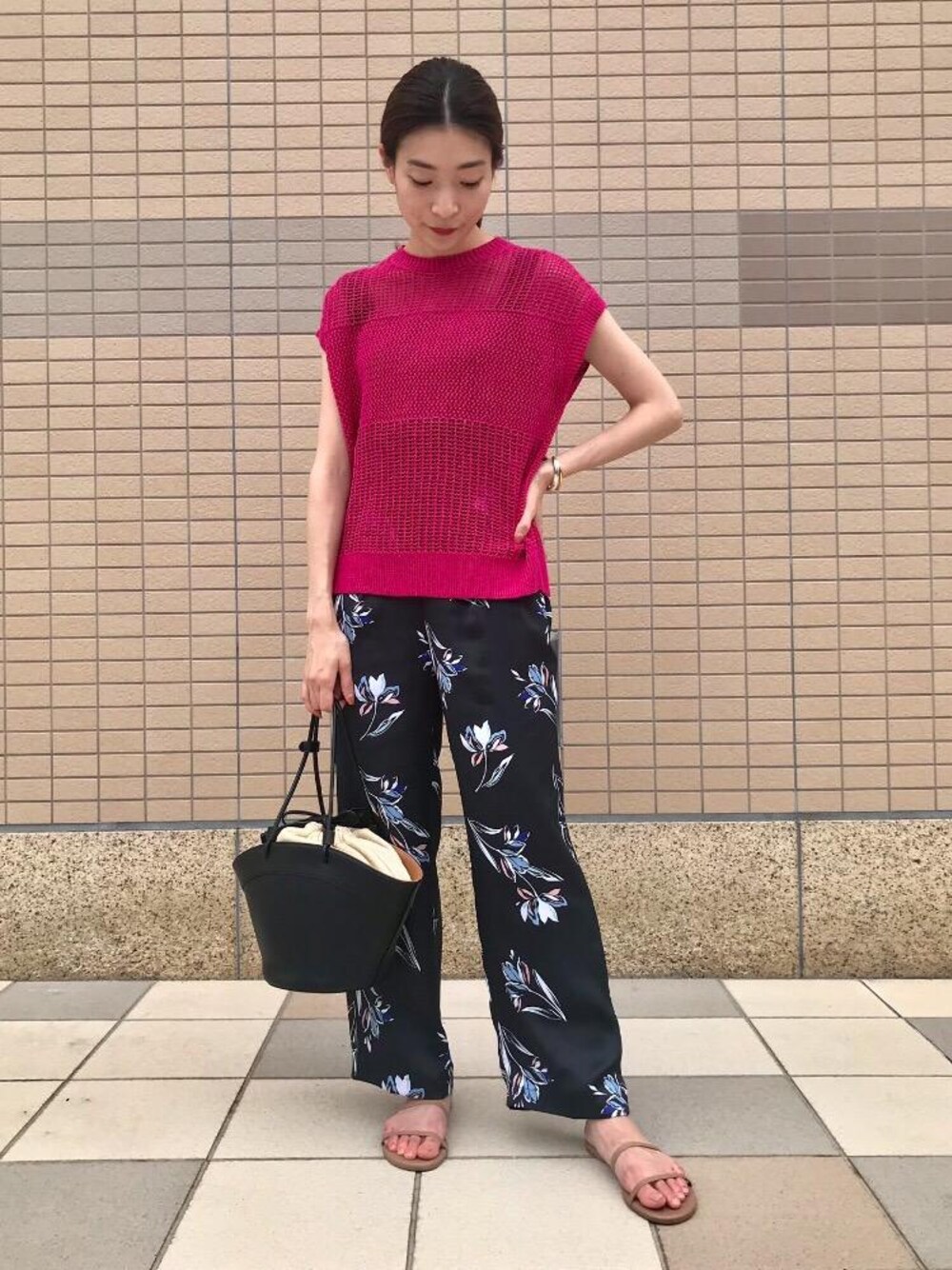 身長:160cm 普段サイズ:トップス36/ボトムス34or36/シューズ24.5cm 【サイズ感】 トップス:フリーサイズの表記ですが、Mサイズ程のサイズ感。 中に着たキャミソール:こちらもフリーサイズですが、SからMサイズのサイズ感。 パンツ:34サイズ着用。ややウエストタイトです。 サンダル:標準的。 【素材感】 トップス:麻55%、綿45%の柔らかい肌触りのニット素材。 中に着たキャミソール:厚手のリブニット。 パンツ:ポリエステルのテロッとした素材。 【着心地】 トップス:フレンチスリーブになっておりますので、腕をすっきり見せれくれます。 パンツ:ウエストがバックゴムになっており、ストレスなく楽です。 【コーディネートポイント】 ピンクのメッシュニットトップスに、品のある花柄プリントのパンツを合わせ、大人カジュアルなコーディネートに致しました。 トップスもパンツもどちらも一枚で様になりますので、いろいろと使い回しができそうです。