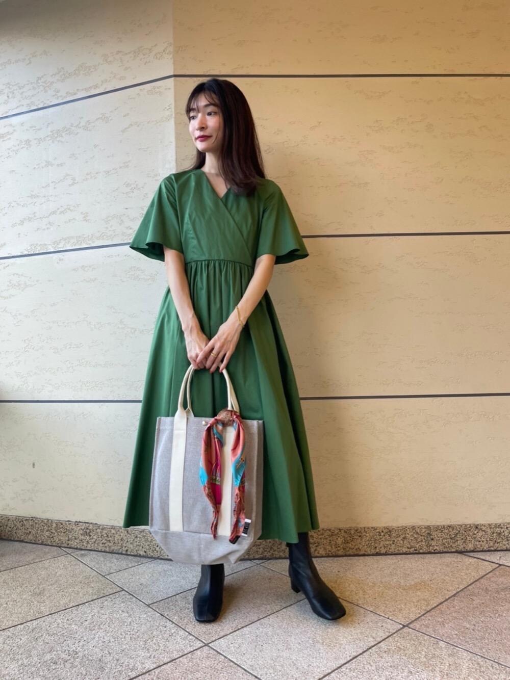 身長:160cm 普段サイズ:トップス36/ボトムス34or36/シューズ24.5cm 【サイズ感】 ワンピース:ややゆったり。 ブーツ:標準的。 【素材感】 ワンピース:張りのある微光沢な素材。 ブーツ:アッパーは柔らかい素材。 【着心地】 ワンピース:ウエストはゴム使用ではないですが、ややゆったりな作りのため、締め付けもなく楽にお召しいただけます。 ブーツ:柔らかいアッパーとヒールの高さが3.5cmと低めなため、足疲れしにくいです。 【コーディネートポイント】 上品なケリーの色味のワンピースに、バッグにスカーフを付け、華やかさをプラス致しました。 足元は秋らしくブーツで合わせました。