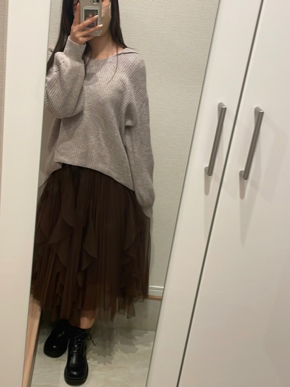 遂にニットを着るようになってしまった𓏲𓇢𓂅🍂 トップスは後ろ見えないけど襟になってて可愛いデザイン♡ スカートは歩いてる時にたまたま見かけて¥2000くらいだったけど高見えヒラヒラついた変わったデザインに一目惚れで購入✧︎*。お店もなにもわからない🥲