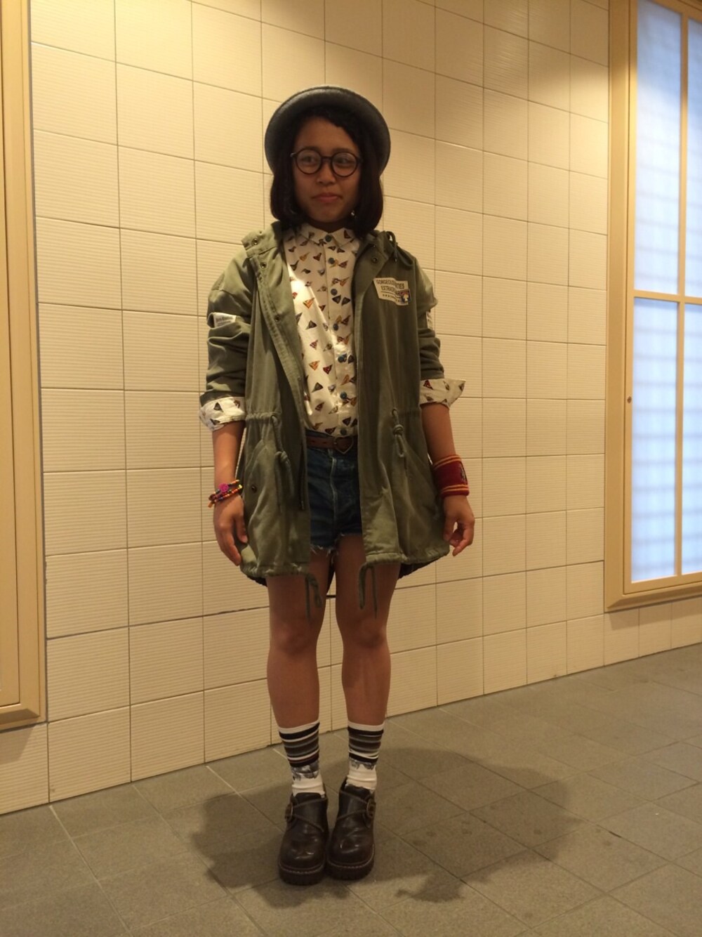 フラッグ柄シャツとステッチの入った茶色の厚底ブーツでビンテージ風にしました😊 ハリーポッターのリストバンドもポイントっ!