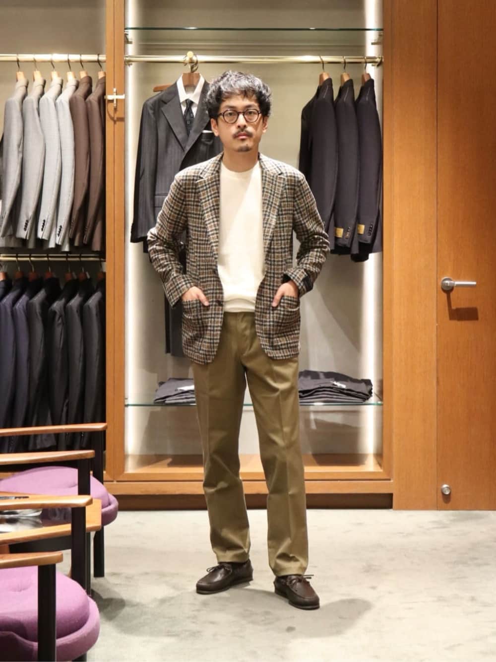 ・年齢:30代半ば ・身長:173cm ・普段サイズ:トップス M/ボトムス M/シューズ 27.0cm 【サイズ感】 ジャケット:46で標準よりほどよくゆとりあり トップス:Mで標準的なサイズ感。ほどよくゆとりあり ボトムス:46でウエストは少しゆとりがあり、股下も少し長め。 シューズ:8で厚手、薄手のソックスどちらでも履けるゆとりあり。 【コーディネートポイント】 テーマはカジュアルなジャケットスタイル。 普段使いとして軽めに羽織っていただけるジャケットなので、ちょっとしたお食事やパーティにも対応可能なコーディネートです。 全体をブラウントーンでまとめて、秋を感じるカラーコーディネーションにしました。