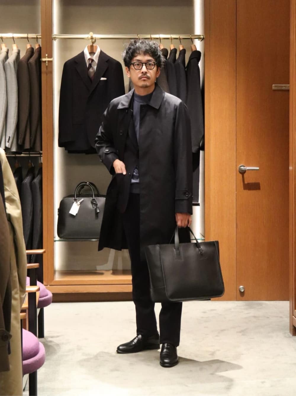 ・年齢:30代半ば ・身長:173cm ・普段サイズ:トップス M/ボトムス M/シューズ 27.0cm 【サイズ感】 コート:標準的 ジャケット:細身でスッキリ トップス:標準的 ボトムス:細身でスッキリ シューズ:7 【コーディネートポイント】 撥水加工で機能的なステンカラーコートに、ジャージな素材のセットアップ、モックネックニットを合わせたネイビートーンの正統派ビジカジスタイルです。