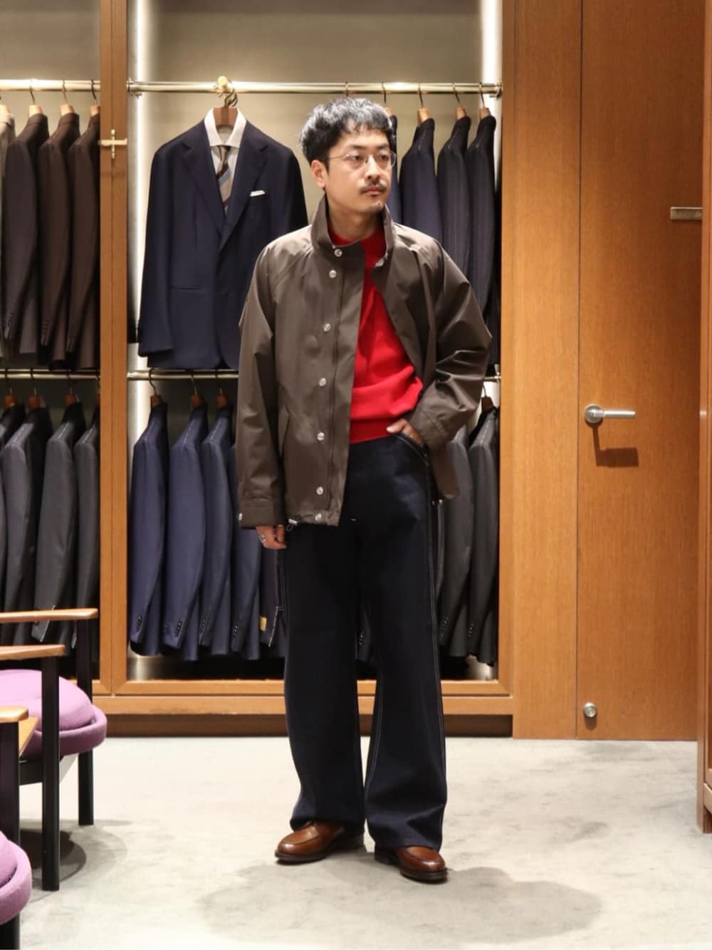 ・年齢:30代半ば ・身長:174cm ・普段サイズ:トップス M/ボトムス M/シューズ 27.0cm 【サイズ感】 アウター:ゆったり (厚手なニットの上からでもゆとりあり) ニット:程よくゆったり (一枚着でも様になる程よくゆったりしたサイズ感) ボトムス:ゆったり (ウエストかなりゆとりあり、ベルトで絞めないと履けないぐらいです。) シューズ:7 (薄手なソックスで程よくゆとりあり) 【コーディネートポイント】 リラックスしたサイズ感のモードなコーディネート。ポイントに赤いニットを合わせました。