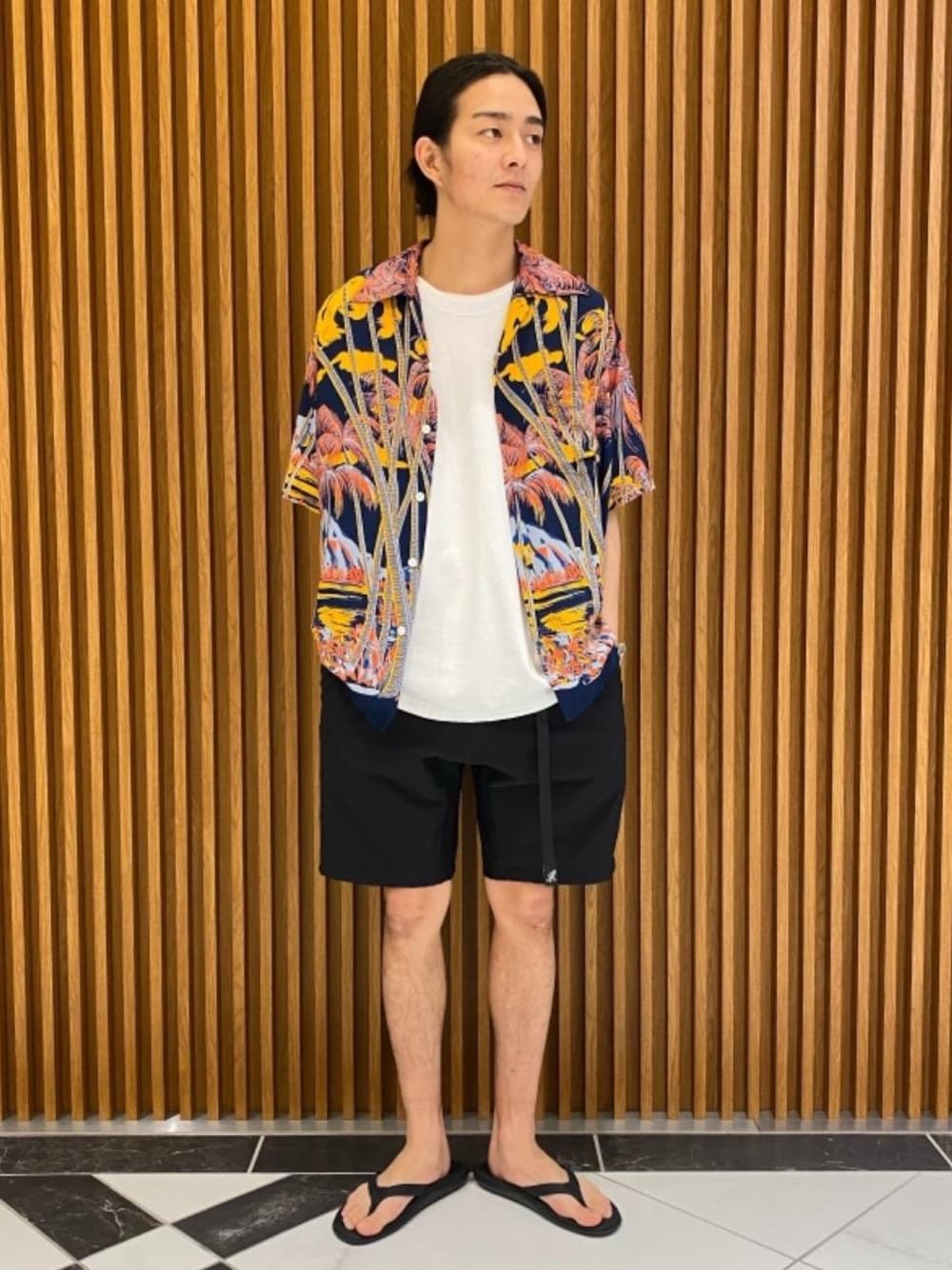 派手なイメージなアロハシャツですがサイズを上げて街でも着れるようシンプルなスタイリングに仕上げました。