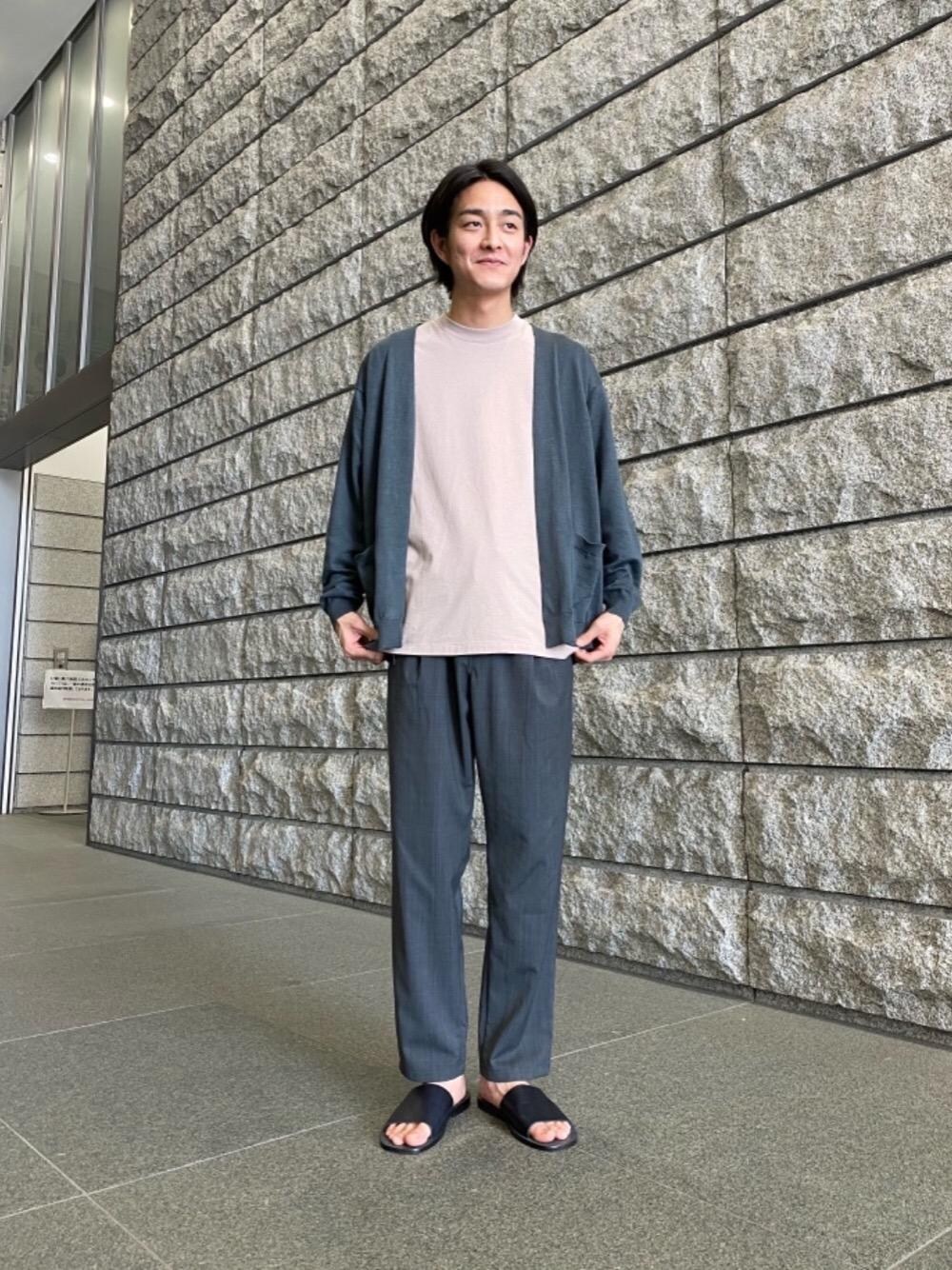 身長:178cm 普段のサイズ:トップスLサイズ、ボトムスMサイズ <サイズ感> トップス:ややゆったり インナー:ややゆったり ボトムス:標準サイズ シューズ:標準サイズ <着心地> トップスに着用しているカーディガンは夏の室内の羽織としてお使いいただきやすい生地感となっております。ボトムスはウエスト部分がゴムとなり、ストレッチ性があるので快適な履き心地となります。 <コーディネートポイント> 色味のあるトップスをグレーでまとめたコーディネートです。ボトムスとカーディガンを同系色にすることで落ち着いた印象となります。