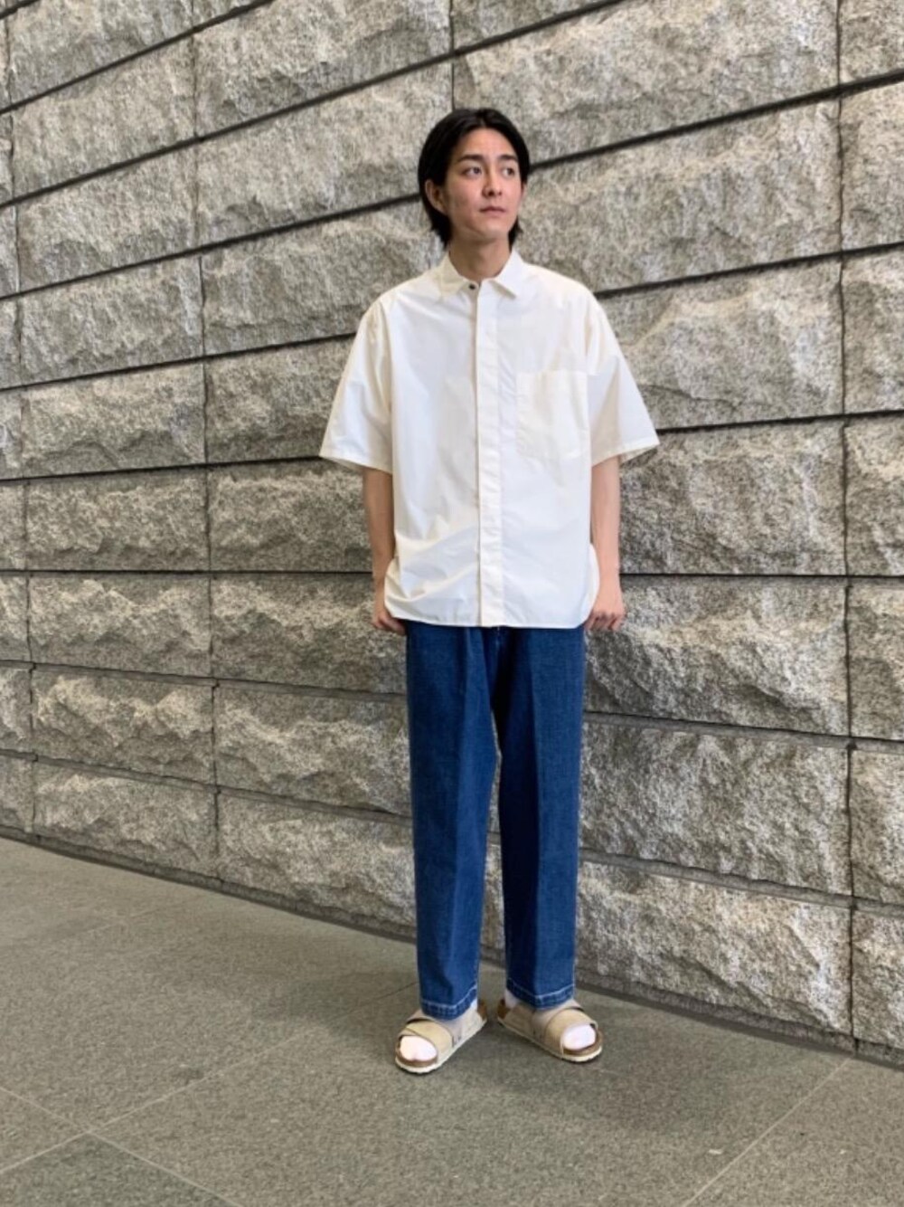 身長:178cm 普段のサイズ:トップスLサイズ、ボトムスMサイズ <サイズ感> トップス:ゆったり ボトムス:ゆったり <素材感> トップスはハリのある着心地。 ボトムスはデニム生地となり1年通して着用いただける生地感。 <着心地> トップス、ボトムス共にゆとりのあるサイズ感となりリラックスして着用していただけます。 <コーディネートポイント> 清涼感が感じられるコーディネート。 ゆとりのあるシルエットですが、シャツは比翼仕様となりスッキリした印象となります。