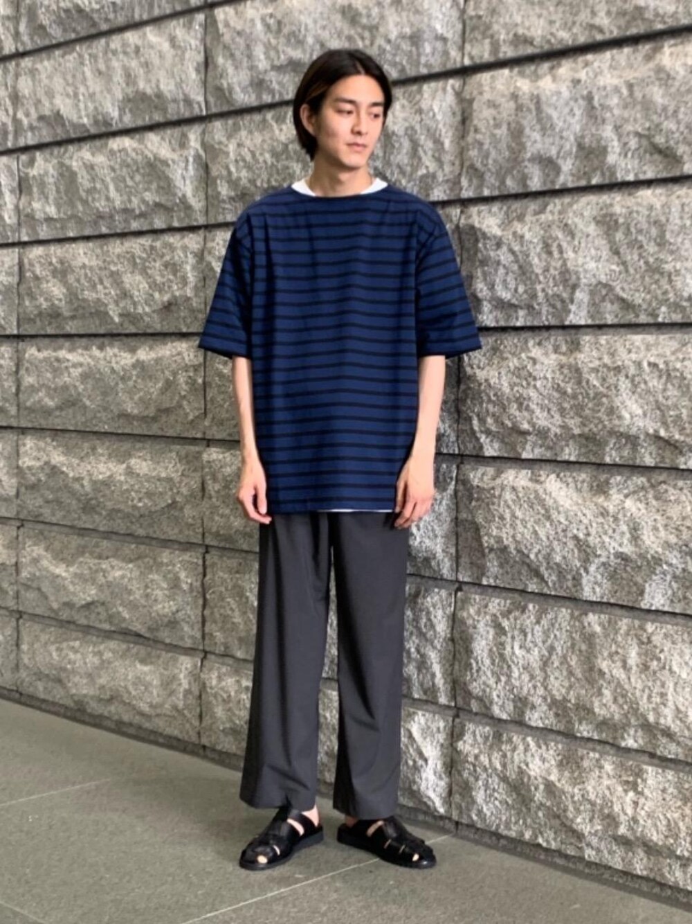 身長:178cm 普段のサイズ:トップスLサイズ、ボトムスMサイズ <サイズ感> トップス:ゆったり ボトムス:ゆったり <素材感> トップス、ボトムス共にサラッとした素材感 <コーディネートポイント> 春先に展開していたLeminor別注のバスクシャツはオーバーサイズでゆったりとした着心地です。 マリンな印象が強くなりすぎないよう、暗めのトーンでまとめ落ち着いた印象のコーディネートに仕上げました。