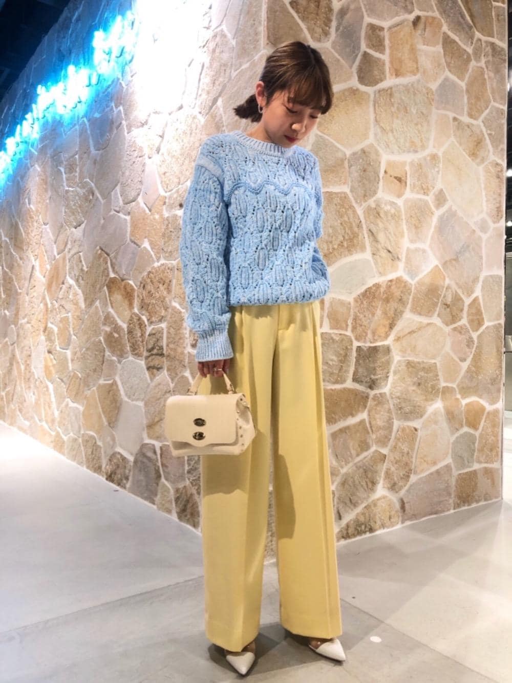 春を感じさせてくれるコーディネート。小物は白で統一し、ニットとパンツのカラーを主役にしました。
