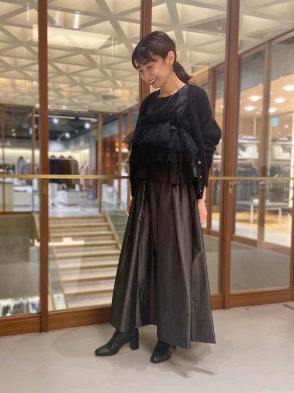 オールブラックのコーディネートも質感を変えると重たくならずおすすめです。