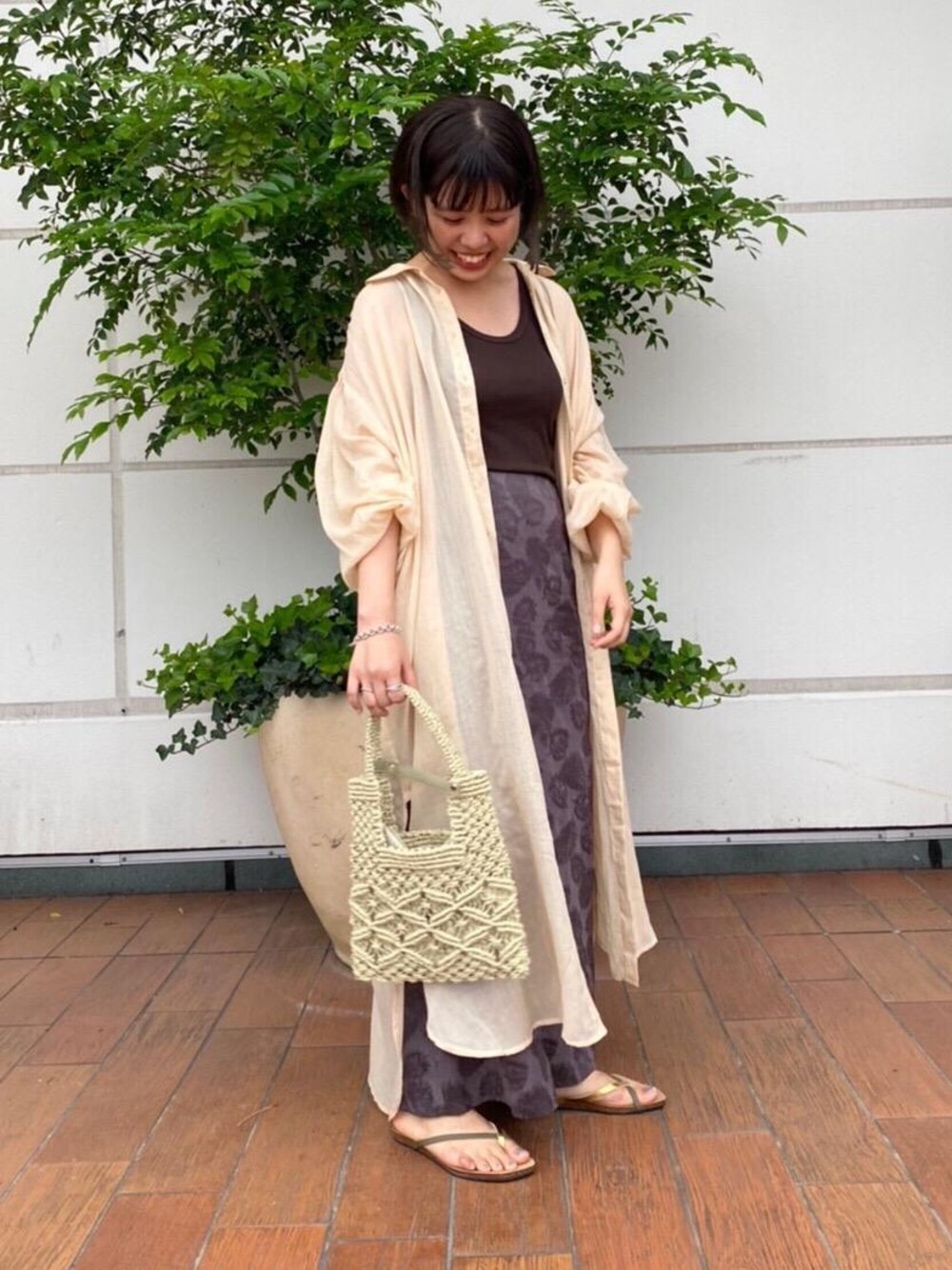 軽めのシャツワンピースや夏らしい素材の小物と、渋めの色味のアイテムを合わせて、今の時期から秋口まで着用できるコーディネートを意識しました。