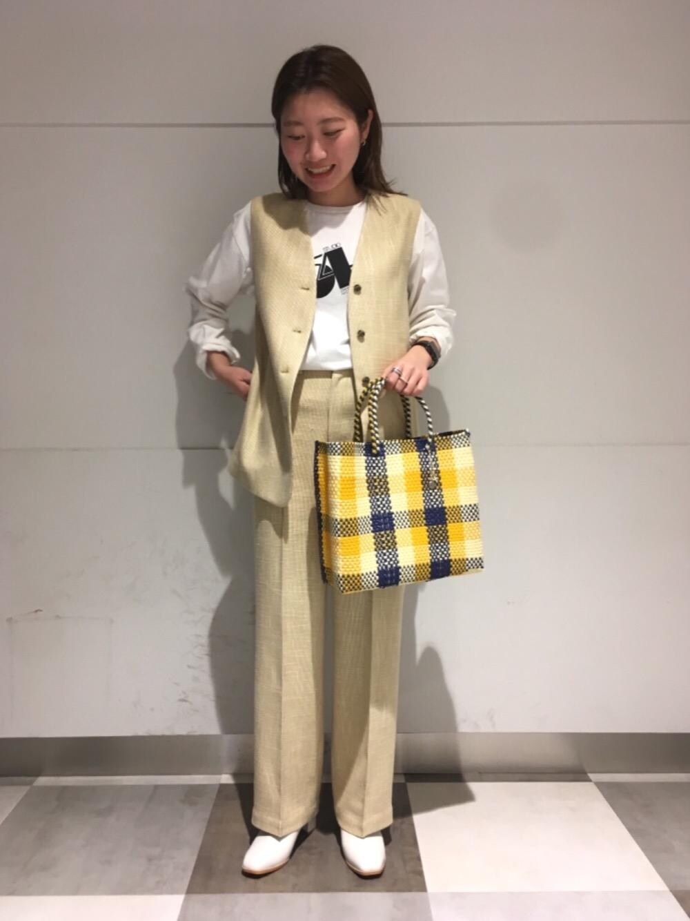 イエロー×ベージュでトーンを合わせたコーディネートにしました! セットアップは夏にTシャツで合わせたり、着まわし力抜群です。
