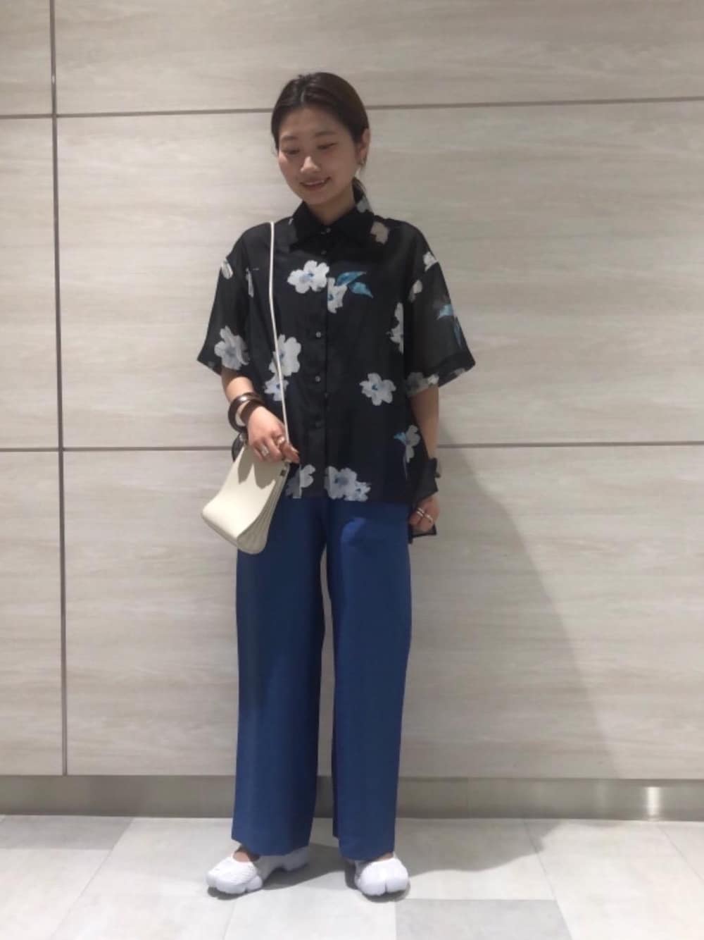 フェミニンな雰囲気でもオススメなシャツですが、今回はブルーと白で、少しクールな雰囲気でコーディネートしました。