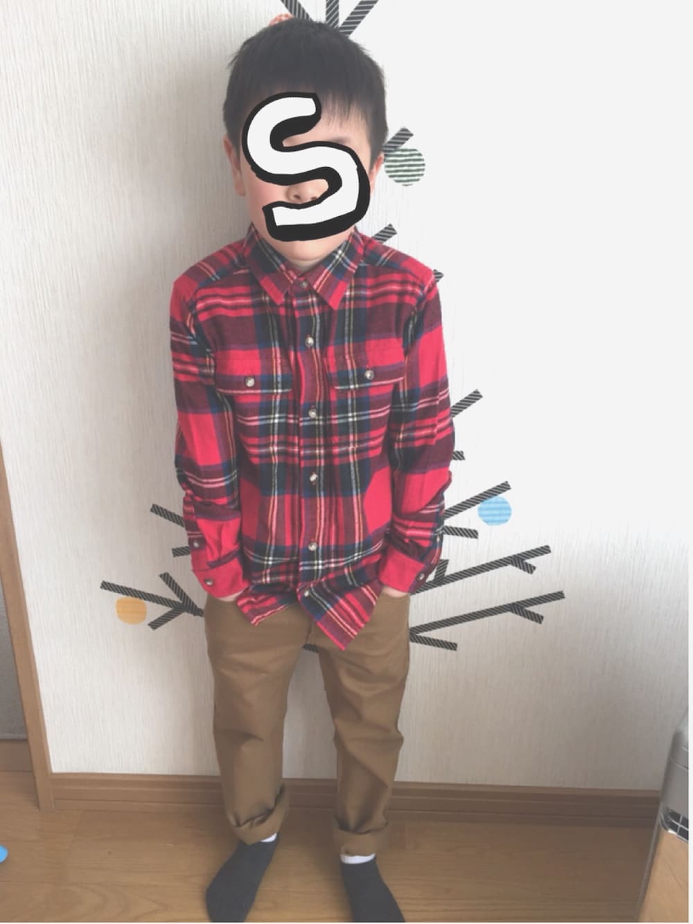 今日の7歳! 赤のチェックシャツに初挑戦! これにニットかぶりました