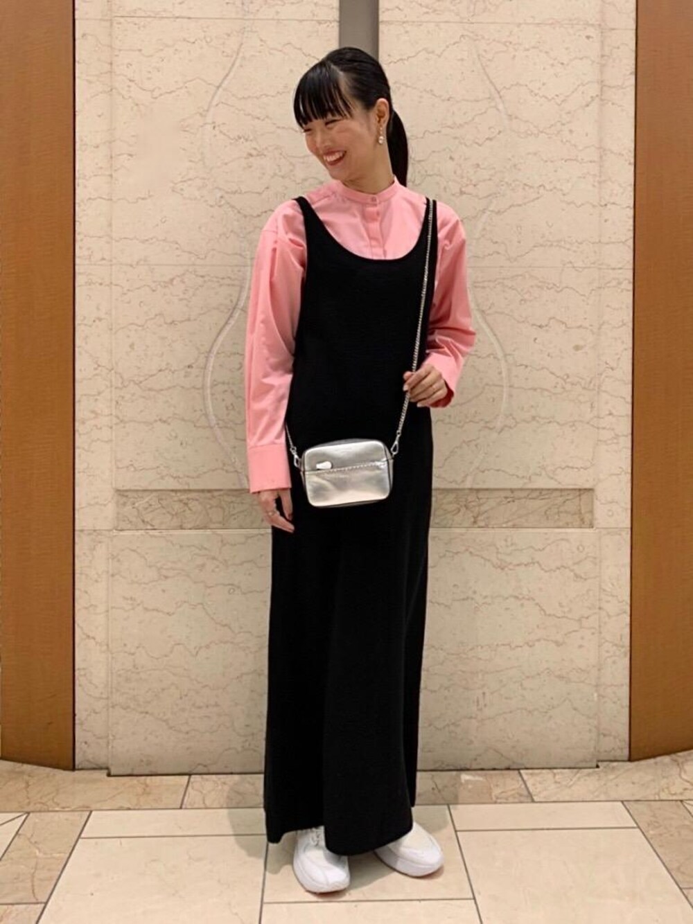 弾力があり、暖かさもあるニットワンピースですが、ノースリーブの形で、首元や背中の開きもあるので重たく見えません。 また、身体のラインも拾いすぎず綺麗に見せてくれるシルエットです。 気分が上がる華やかなピンク色のシャツを入れることで、リラックスしすぎないスタイリングにしました。