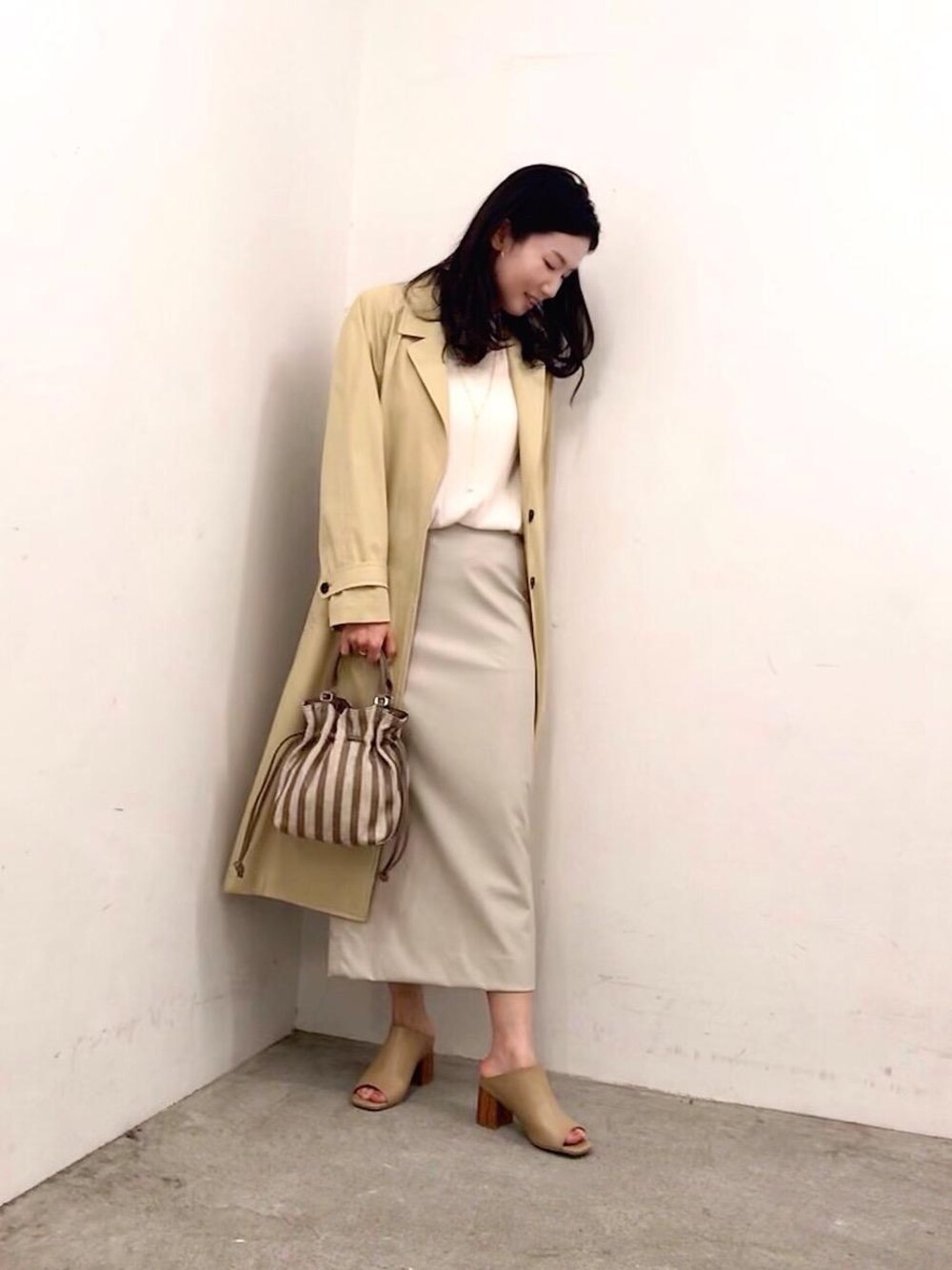 通勤はもちろん、オフの日もラフに羽織れるコットンツイルラップコートがお勧めの柔らかいトーンコーディネート。一見難しそうなフェイクレザースカートも合わせる色味を濃淡で調節して頂くと程よいフェミニンスタイルに◎