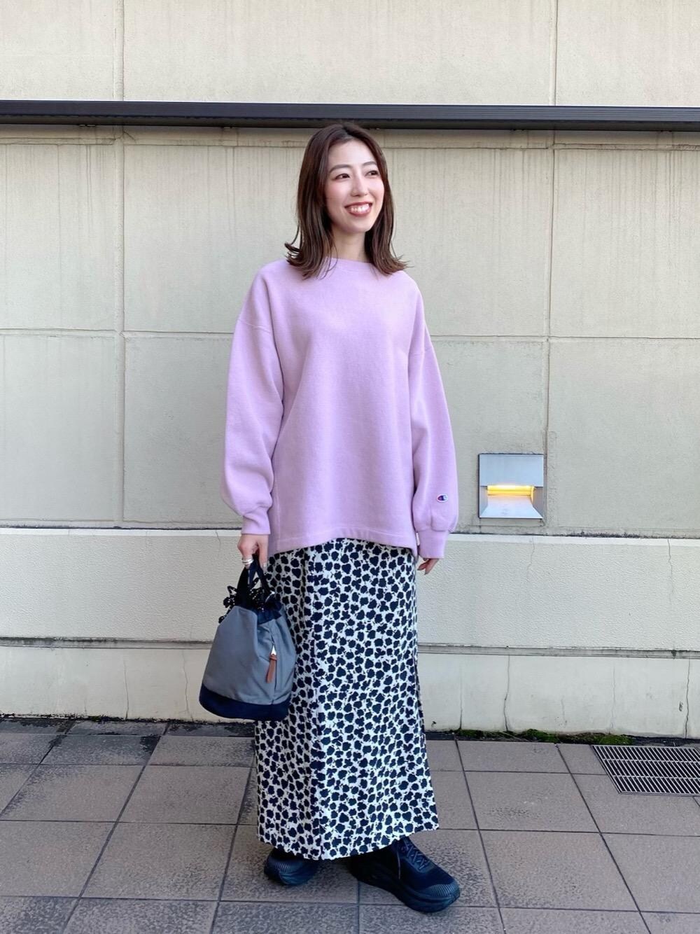 春らしい色のスウェットにIラインシルエットの女性らしい柄スカートを合わせました。ピンクが甘くなりすぎないよう、メンズライクな小物やスニーカーを取り入れています。