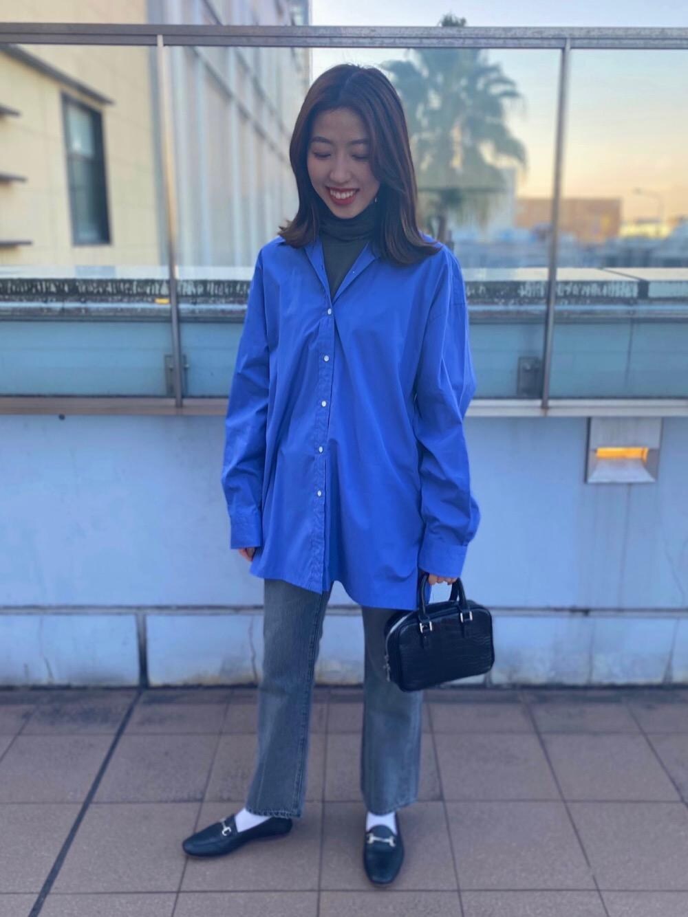 鮮やかなブルーのシャツにタートルネックのインナーを組み合わせ、肌寒いこの時期でも春らしいアイテムを楽しめるようスタイリングしております。オーバーサイズのシャツに相反するレザー調の小物で大人な雰囲気にまとめました。