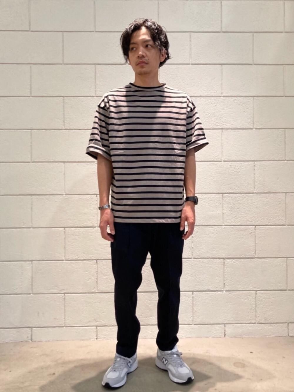 ○身長:174cm ○普段サイズ:トップスL/ボトムスL/シューズ27.5cm 【サイズ感】 トップス:緩め ボトムス:やや細め シューズ:標準的 【素材感】 トップス:薄くなめらかな素材 ボトムス:さらさらした素材 【着心地】 トップ:ゆったりとした動きやすい着心地 ボトムス:肌離れしやすい着心地 【コーディネートポイント】 ベージュのボーダーTと紫の刺繍が特徴の別注NBを合わせ、定番のマリンスタイルとは一味違ったカラーのスタイリングです。