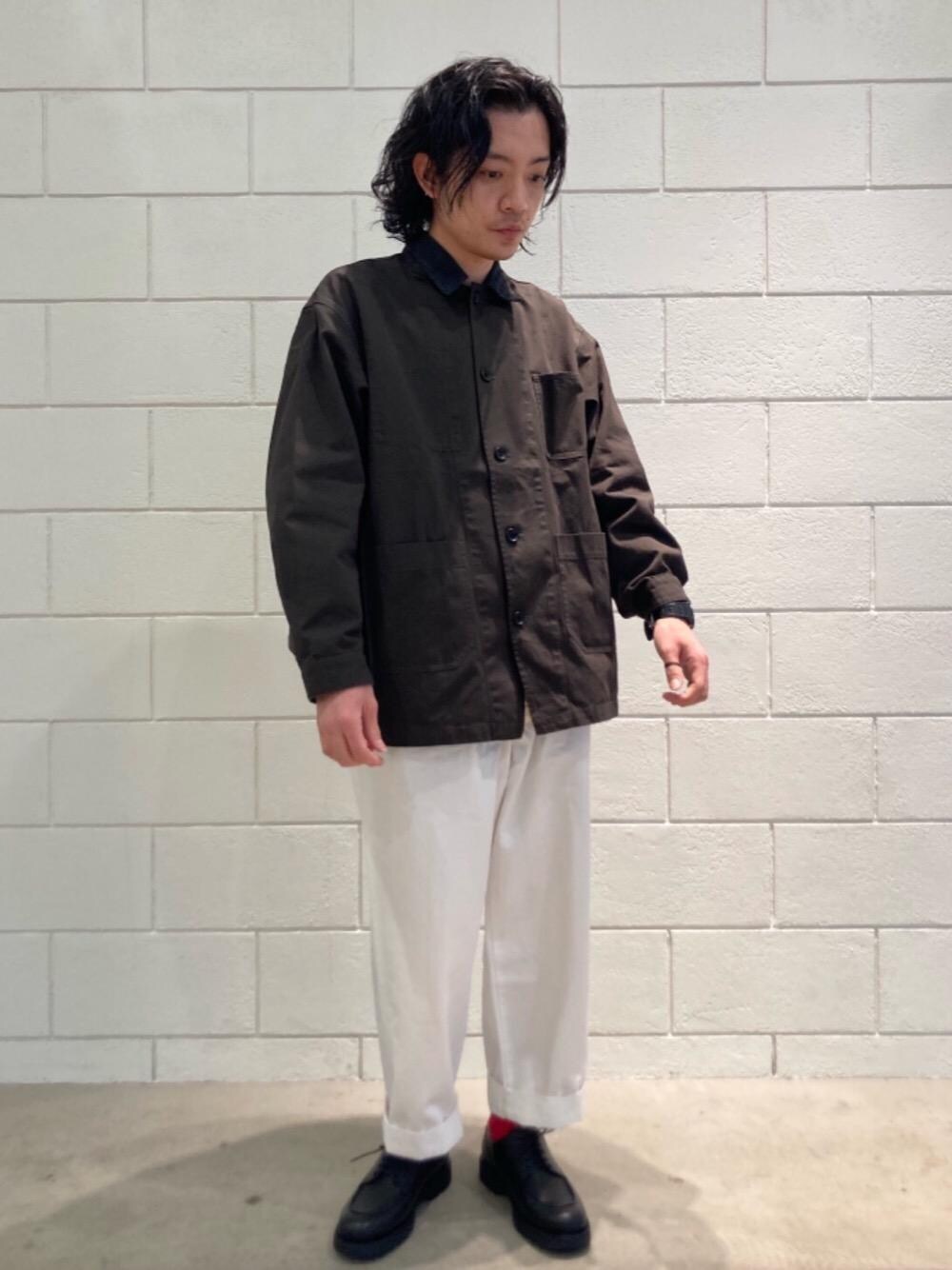 ○身長:174cm ○普段サイズ:トップスL/ボトムスL/シューズ27.5cm 【サイズ感】 トップス:緩め ボトムス:緩め シューズ:標準的 【素材感】 トップス:しっかりとした素材 ボトムス:やわらかな素材 【着心地】 トップス:ゆったりした着心地 ボトムス:ゆったりした着心地 【コーディネートポイント】 カバーオール×ホワイトパンツの爽やかさにレザーシューズで渋さもプラスした、 大人めな春のワークスタイルです。