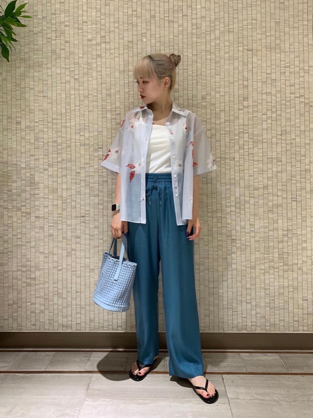 【年齢】 20代前半 【身長】 158cm 【普段サイズ】 トップス36/ボトムス36/シューズ24cm 【サイズ感】 トップス:標準 ボトムス:標準 シューズ:標準 【素材感・着心地】 トップス:さらっとした肌触りで、透け感のあるポリエステル素材です。 ボトムス: ウエストゴムで、とても履き心地が良いです。 【コーディネートポイント】 全体的にブルートーンで合わせ、爽やかな印象にしました。パンツはテーパードワイドシルエットで、トップスとのバランスが取りやすいです。