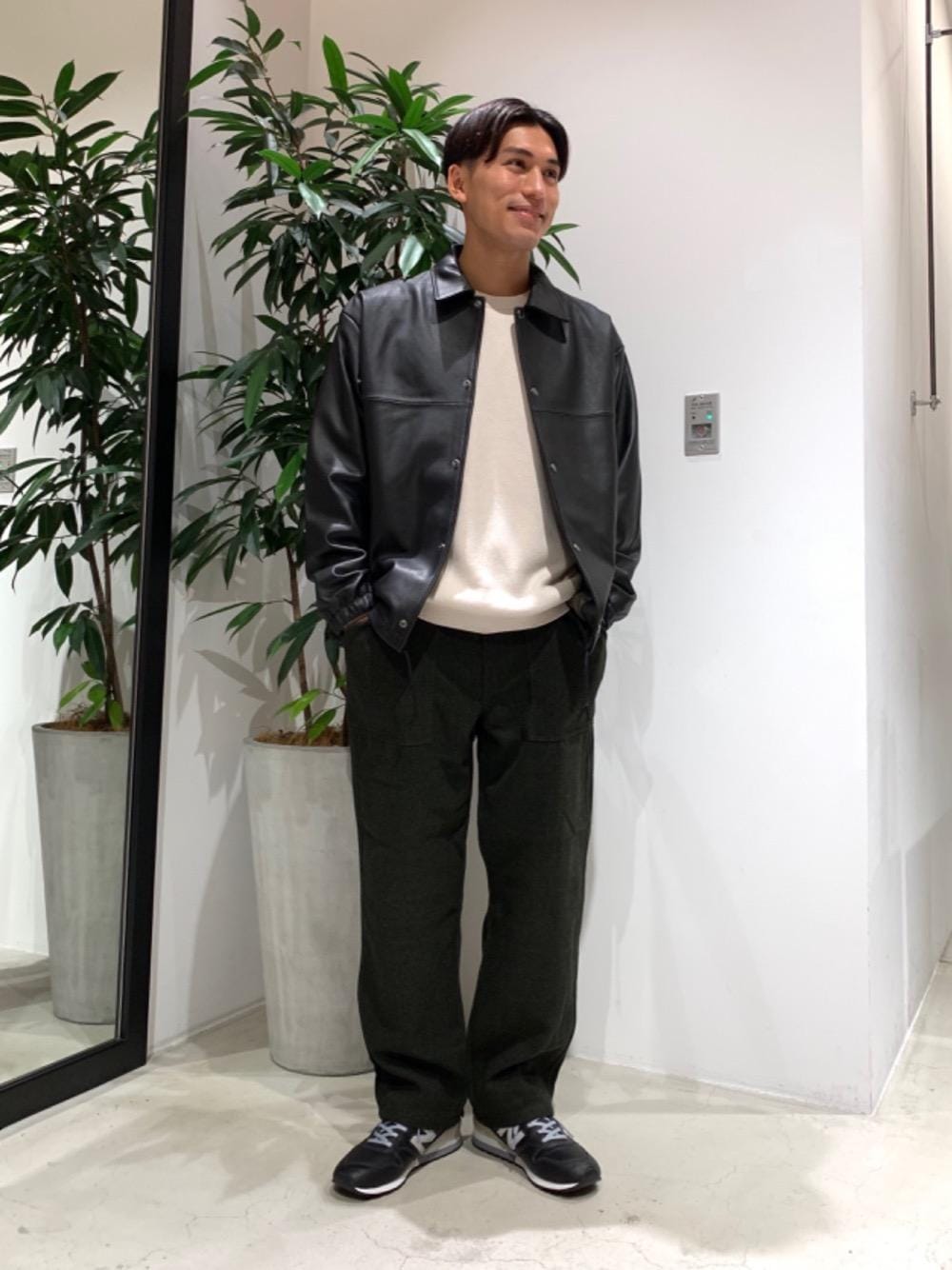 ○レザーコーチジャケット 無骨なレザージャケットの印象を和らげるため、インナーには柔らかい雰囲気のニットを合わせました。 インナーをニット以外にもシャツやパーカーなどに変えることで印象がガラッと変わるので、日々のスタイリングを楽しむことができるアイテムです。