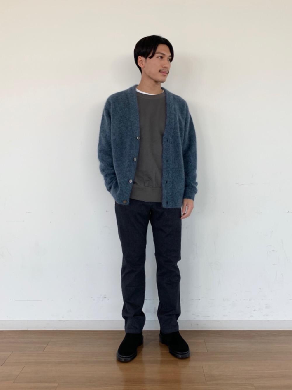 グレイッシュなブルーが綺麗なモヘア混のカーディガンをメインに、全体を落ち着いたトーンでまとめました。 見た目通りモフモフと柔らかい質感のカーディガンは、軽い着心地でとても暖かいです。 細身のパンツやスラックス合わせで綺麗に着たりルーズなデニム合わせで古着っぽく着たりと、特徴的な生地とは裏腹に色々なテイストで合わせやすいのでオススメです。