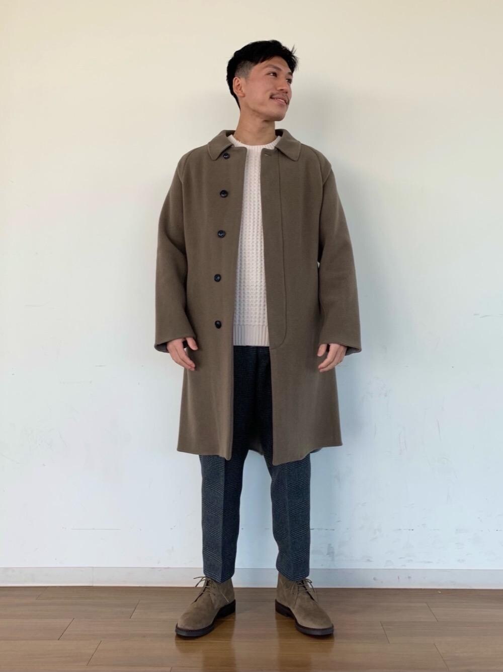 綺麗なモカの色味のバルカラーコートをメインに、定番のニット スラックス ブーツで上品にコーディネートしました。 シンプルですが、しなやかな生地のコートに対してざっくり編みのニットで表情に変化をつけたのがポイントです。 コートは軽い着心地に加えてとても肌触りが良く、優しい温もりを感じられるのでオススメです。