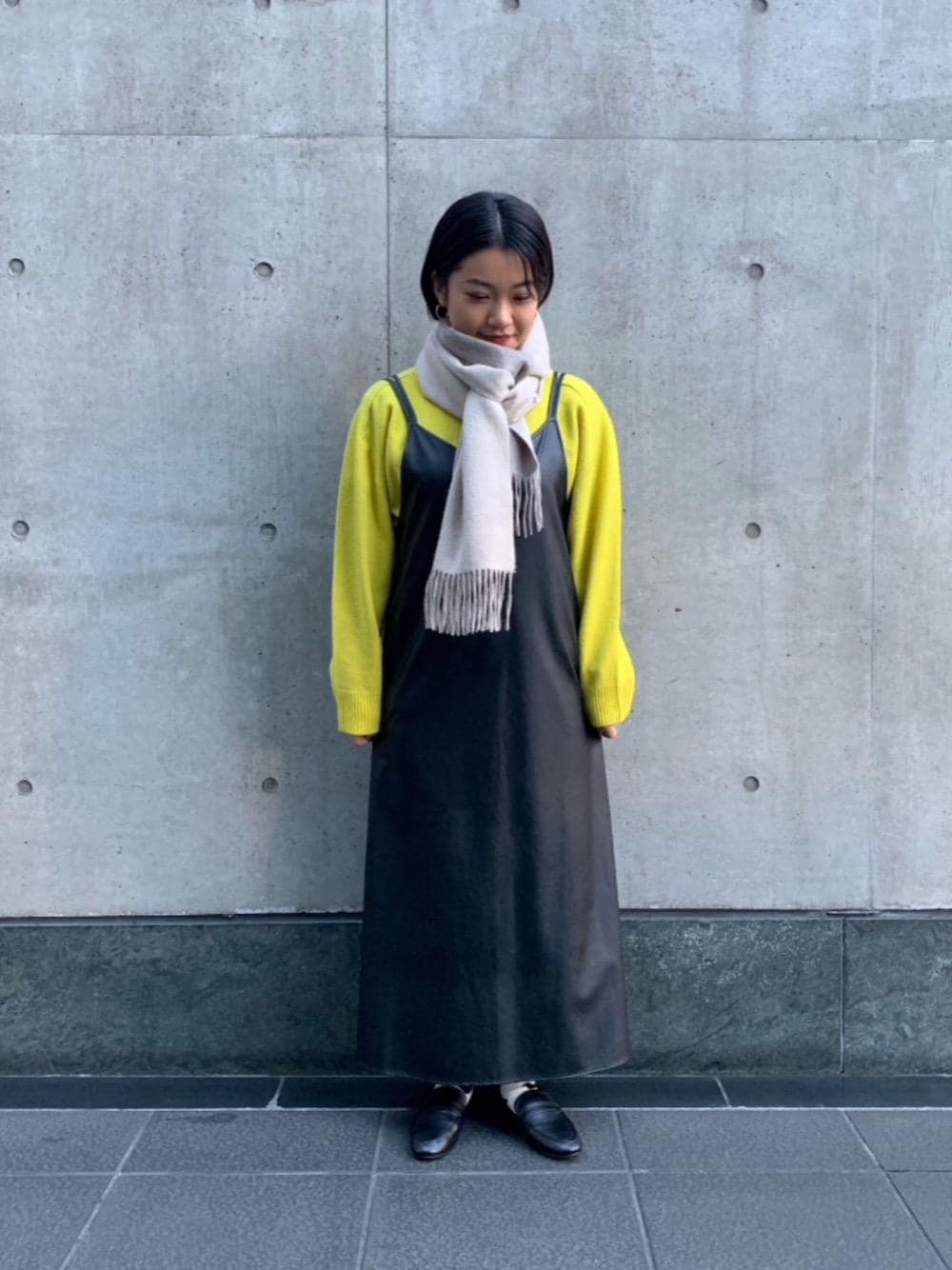 秋冬ならではのフェイクレザーワンピースとウールニットの組み合わせはトレンドを楽しめる組み合わせです。