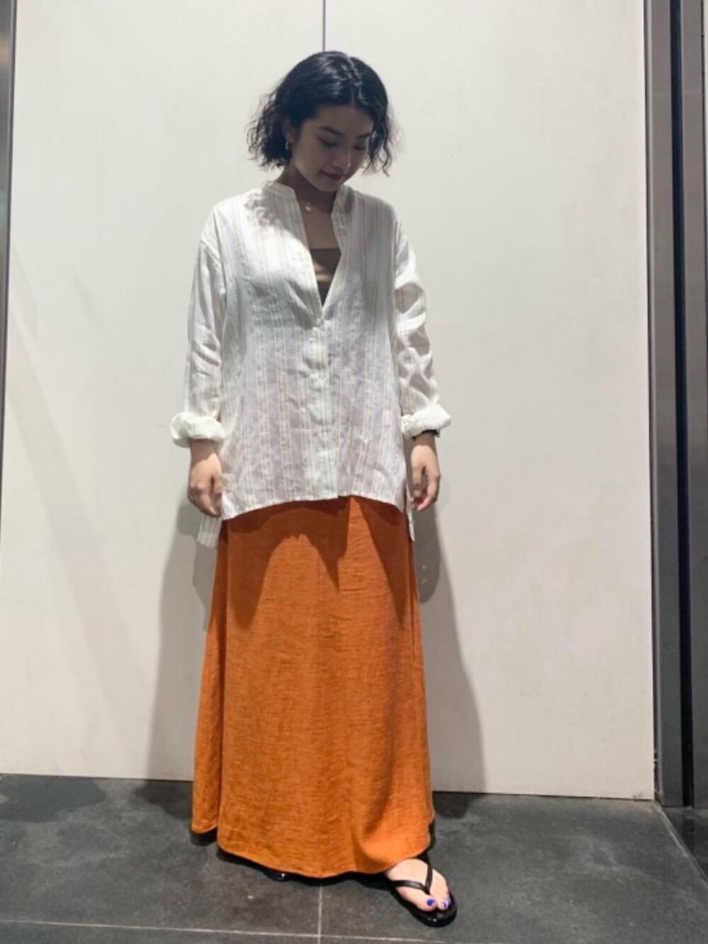 【年齢】20代前半 【身長】153cm 【普段サイズ】トップスS・ボトムスS・シューズ24cm 【サイズ感】スカート:普通です。ジャストサイズで履くと綺麗にお召しいただけます。 【着心地】柔らかく、涼しい夏場にぴったりなアイテムです。 【コーディネートのポイント】 春夏らしいオレンジの色味が、一着で様になるスカートです。 麻素材のシャツを羽織り、更に清涼感を意識しました。