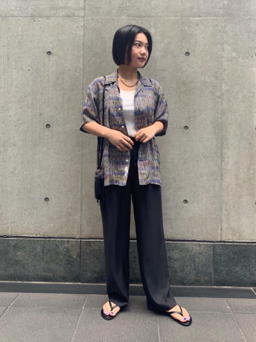 【年齢】20代前半 【身長】153cm 【普段サイズ】トップスS・ボトムスS・シューズ24cm 【サイズ感】 シャツ:標準的ですが少しゆったりしております。 ボトムス:ウエストゴムで、ゆったり履いていただけます。 【着心地】 シャツ:レーヨン素材でさらっとしていおり、涼しくお召しいただけます。 ボトムス:ストレートな形で、締め付け感がない着心地です。 【コーディネートポイント】 全体的にラフなコーディネートにしたかったので、パンツはあえてMサイズを着用しました。<TOWN>の別注シャツもMサイズを着用しておりますが、大きすぎずメンズライクな印象で着ていただけるのでおすすめです。
