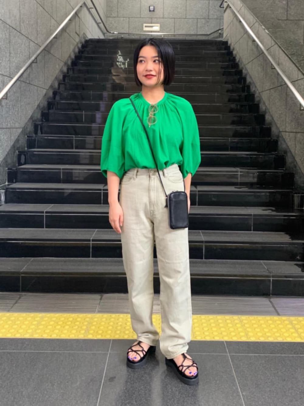 【年齢】20代前半 【身長】153cm 【普段サイズ】トップスS・ボトムスS・シューズ23.5-24cm 【サイズ感】 トップス:標準的、袖周りゆったりしております。 【着心地】 トップス:コットン100%で肌触り抜群です。 【コーディネートポイント】 デニムとトップスのカラーを合わせ、統一感を出しました。デニムのライムは濃すぎず、カラー物を挑戦したい方におすすめのアイテムです! 小物を黒で合わせ、コーディネートを引き締めました。