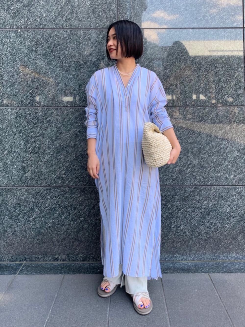 【年齢】20代前半 【身長】153cm 【普段サイズ】トップスS・ボトムスS・シューズ23.5-24cm 【サイズ感】 ワンピース:フリーサイズですが、着丈は長過ぎず、ソールの低いサンダルと合わせても、擦れる心配はございません。 【着心地】 ワンピース:少し透け感もあり、長袖ですが涼しくお召しいただけます。 【コーディネートポイント】 全体的に淡いトーンでまとめ、清涼感を意識したコーディネートにしました。バッグはショルダー付きなので2WAYでお使いいただけておすすめです!