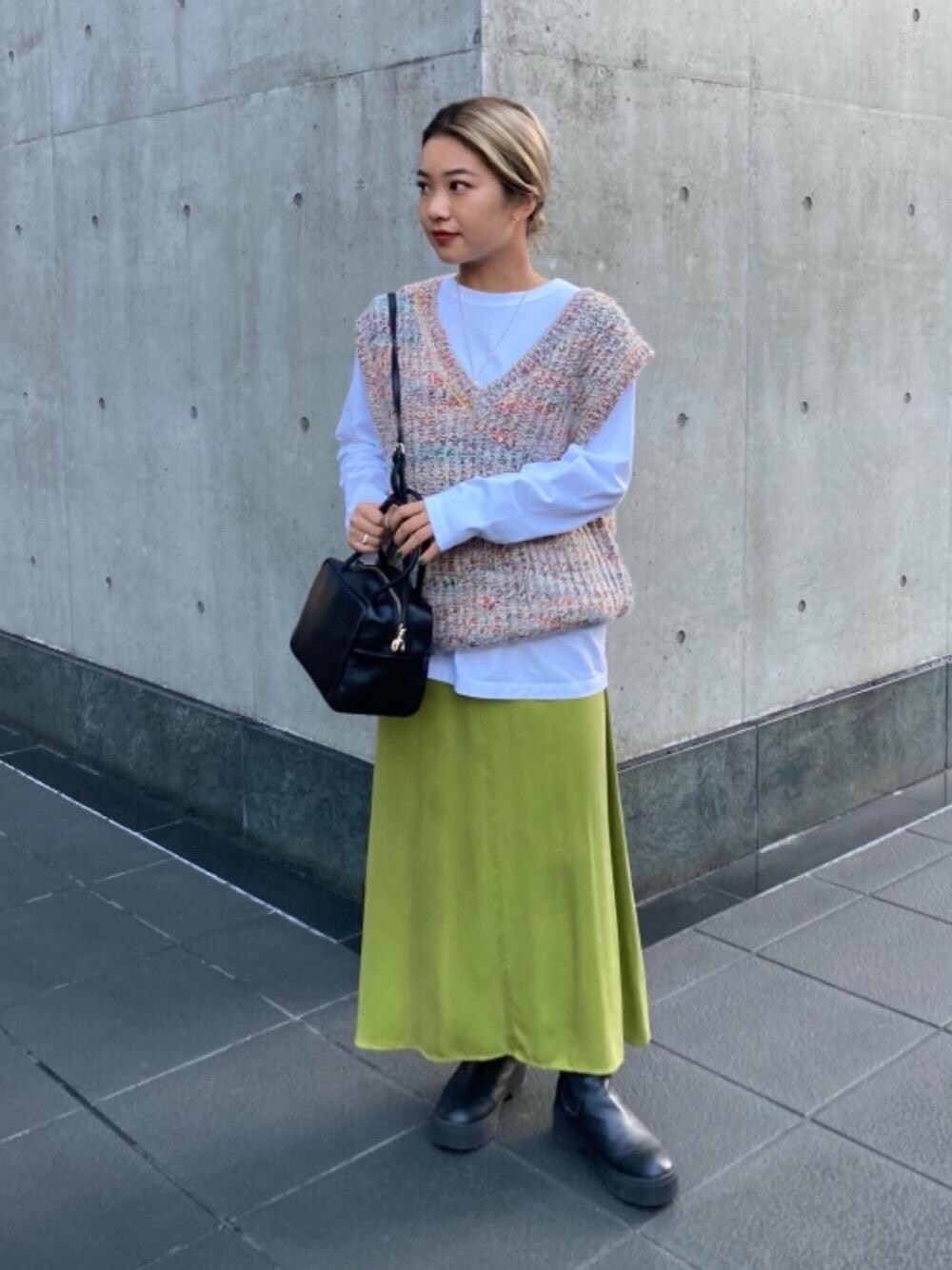 <身長>153cm <普段サイズ>トップスS-M・ボトムスS・シューズ23.5-24cm <サイズ感> トップス:ややゆったり ベスト:ゆったりでオーバーサイズ スカート:標準 <コーディネートポイント> ウールのベストとキュプラのスカートを組み合わせ、異素材で今季のBYらしいスタイリングにしました。