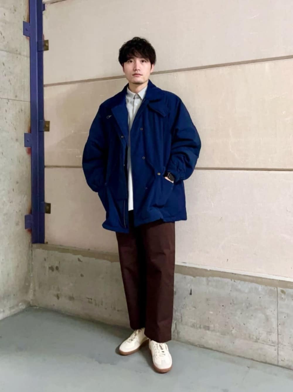 <kinoko.さん×GLR or>着用スタイリング 【サイズ感】 ジャケット(Mサイズ着用) ・ゆったりとしたシルエットです。 ボトムス(Sサイズ着用) ・程よくゆとりあり。 【スタイリングポイント】 青みの強いネイビーのアウターをメインにしたスタイリングです。 ブラウンと合わせる事でより季節感のでる着こなしを楽しめます◎