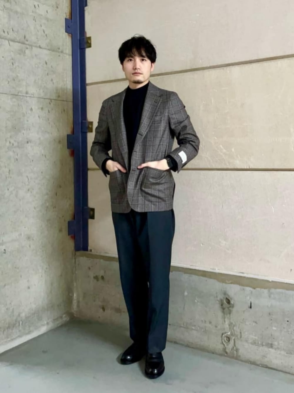 【サイズ感】 アウター(Mサイズ着用) すっきりとしたジャストなシルエットです。 インナー(Mサイズ着用) すっきりとしたシルエットです。 ボトムス(Lサイズ着用) プリーツ入りでややゆとりのあるシルエット。 【スタイリングポイント】 スタイリッシュながらも季節感のあるビジネスカジュアルスタイリングです。 インナーにモックネックを合わせる事でスマートな印象になるのでおすすめです◎