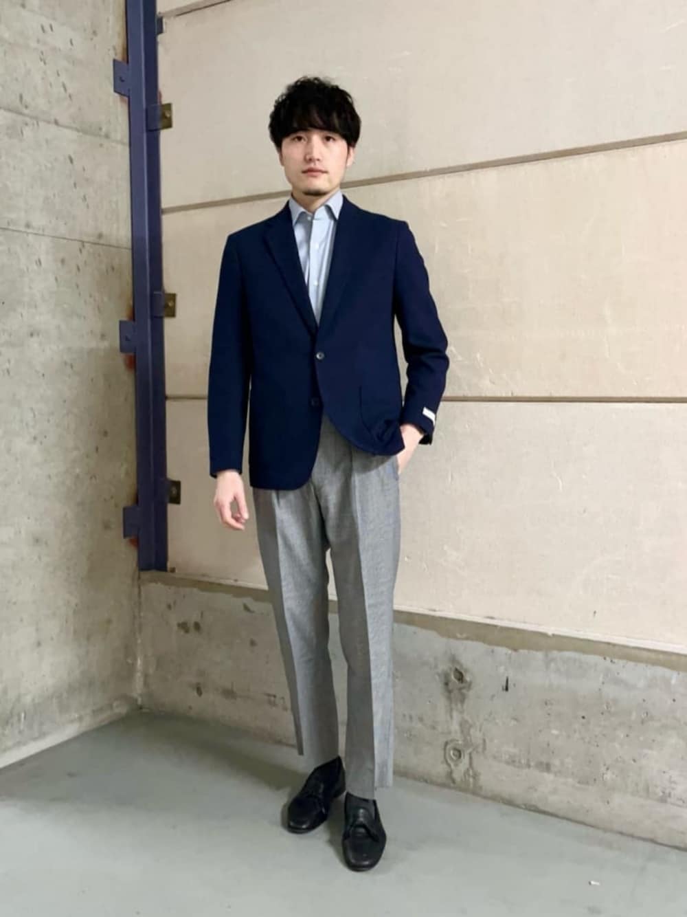 【サイズ感】 すべてMサイズ着用 ジャケット : すっきりとしたシルエット スラックス : 渡り幅が程よくゆとりあり 【ポイント】 ベーシックなネイビー×グレーのジャケパンスタイルです。トレンドのタック入りスラックスにする事で程よくカジュアル感と洒落感が演出できておすすめです◎