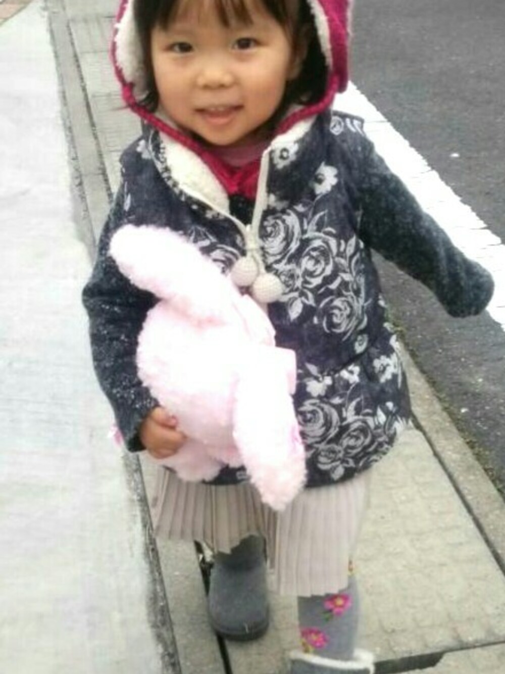 全体的にグレーのコーディネートにピンクのお花のタイツとインナーをチョイスしました!ワインレッドのニット帽がアクセントです!