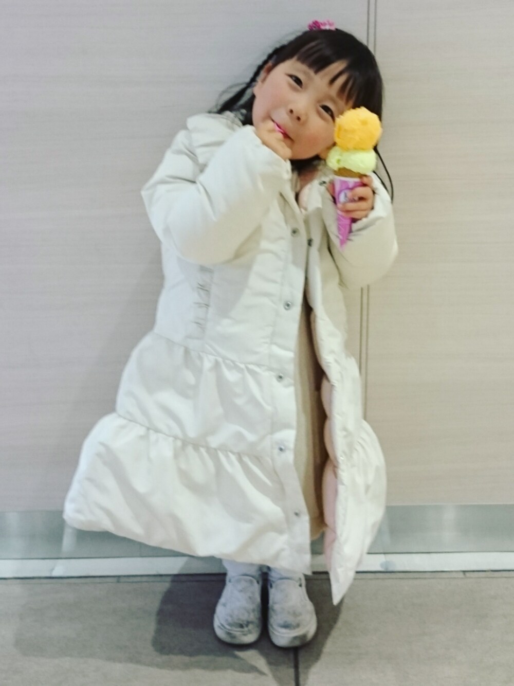 ダウンコートコーデ💙 インナーはベージュのワンピにホワイトタイツを着ています🎵 初めて表参道に行きました✨ ゆんちゃん、SHOPの前にいるぬいぐるみの犬にビビってました(笑)いっぱい歩いて疲れた~💦 地元着いてからはいつものお決まりの寒いのにサーティワンアイスクリーム🍨幸せそうです🎵 今日も見てくださりありがとうございます☺✨