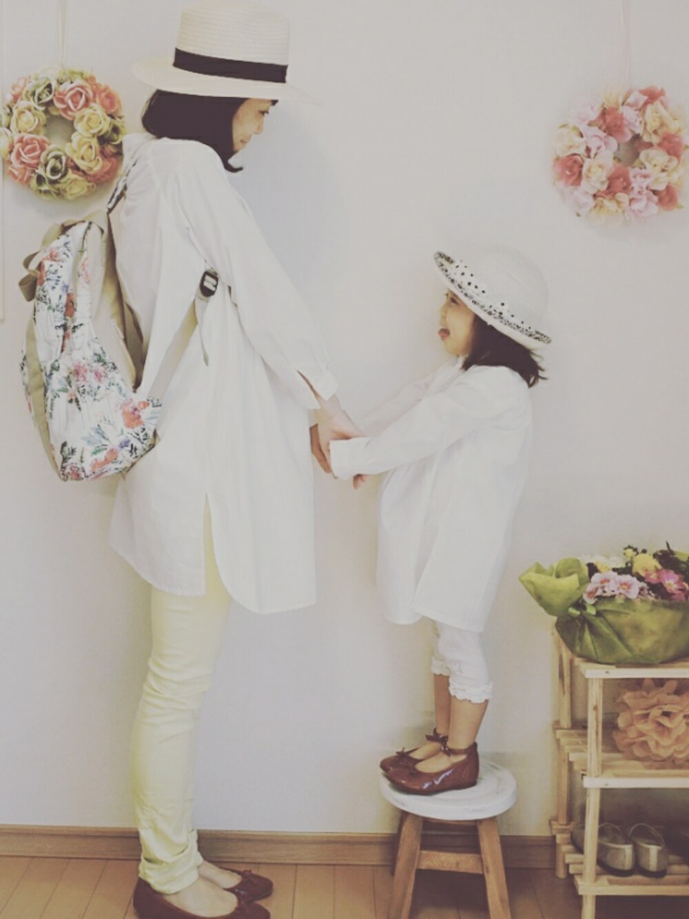 ポカポカ陽気の日のおやこーで🌷 白シャツワンピに赤のバレエシューズでリンク😊 今日も見てくださりありがとうございます❤